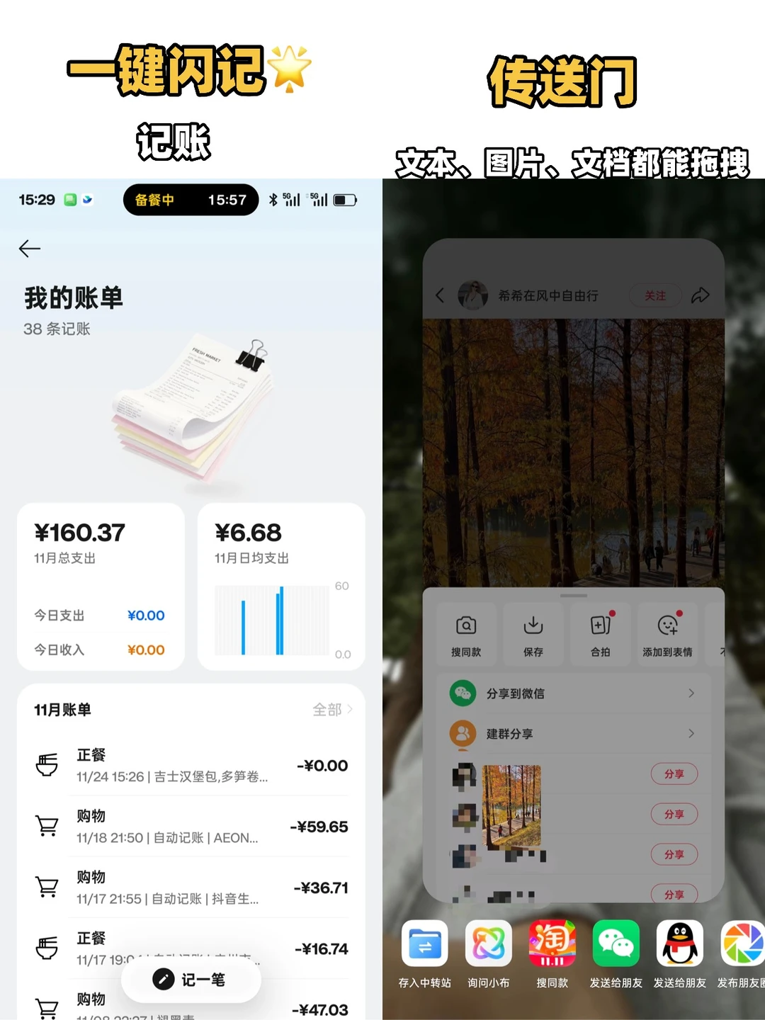 我近期在用Find X9 Pro,怎么说呢,半个多月基本没卡顿过,取餐码上岛很舒服,上班前点一杯咖啡,无需打开应用,瞄一眼手机就行,上周还更新了传送门,图片、文字甚至文档都能拖拽到底部,快速识别和搜索🔍,对打工人来说蛮好用的