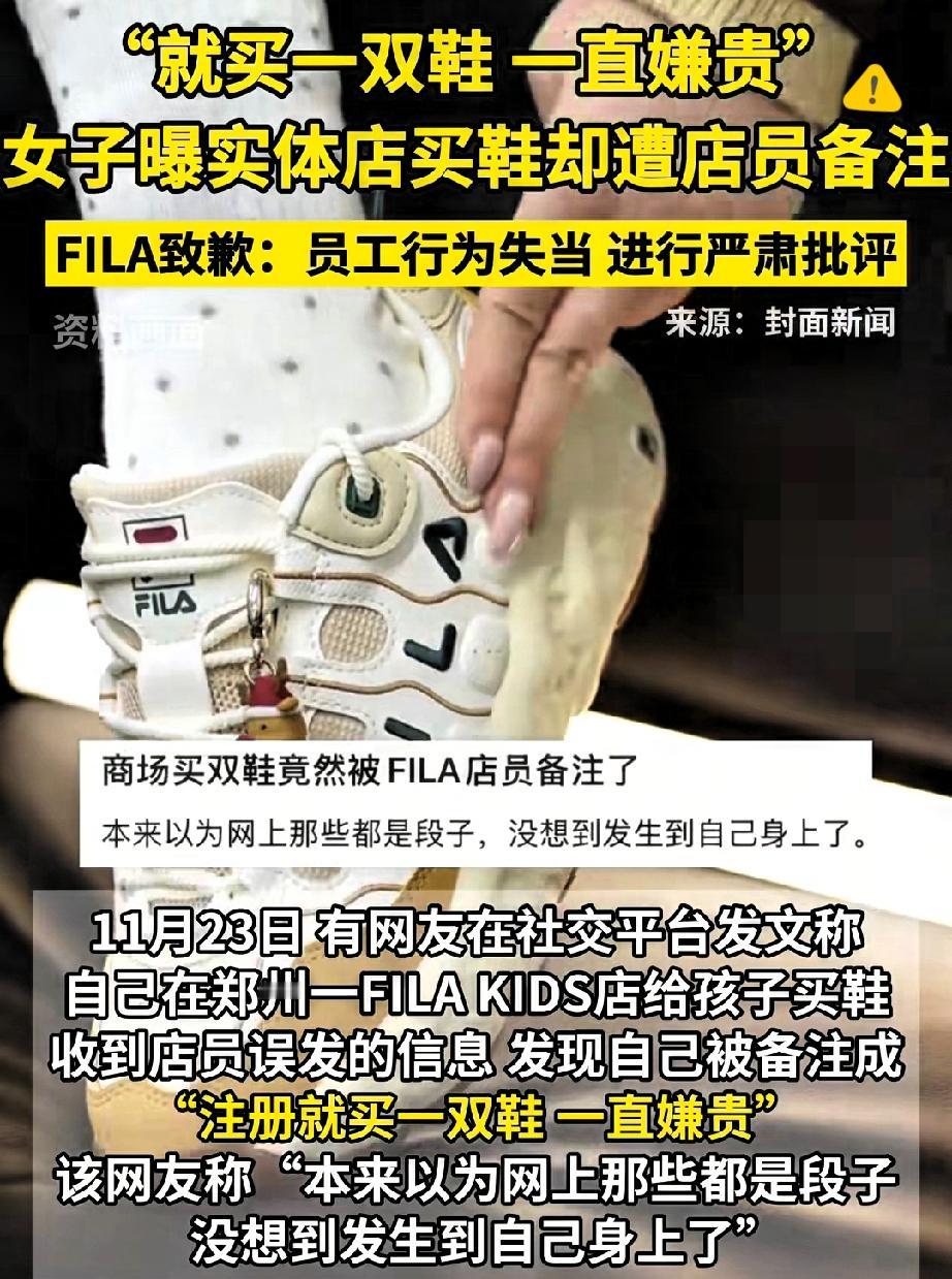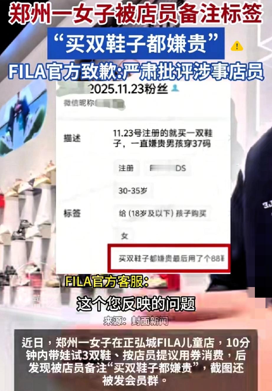 花钱还得被贴标签? 郑州宝妈斐乐十分钟爽快买鞋,反倒被店员备注“买双鞋都嫌贵”,截图还甩进会员群,店长更绝,直接解散群聊躲事儿! 最气人的不是被议论,是店员把品牌光环当成自己的优越感,把顾客按花钱多少分三六九等。 消费者权益保护法明确说了人格尊严受尊重,这背地里贴标签、泄露信息,既没职业素养,又踩了法律底线。 品牌一句“严肃批评”太敷衍,真正的顾客至上,是不管消费多少都能被平等对待。 消费买的不只是商品,还有被尊重的体验,再大牌的服务,没了尊重也迟早凉。 你遇到过店员区别对待吗?要是被偷偷贴标签,你会怎么维权?