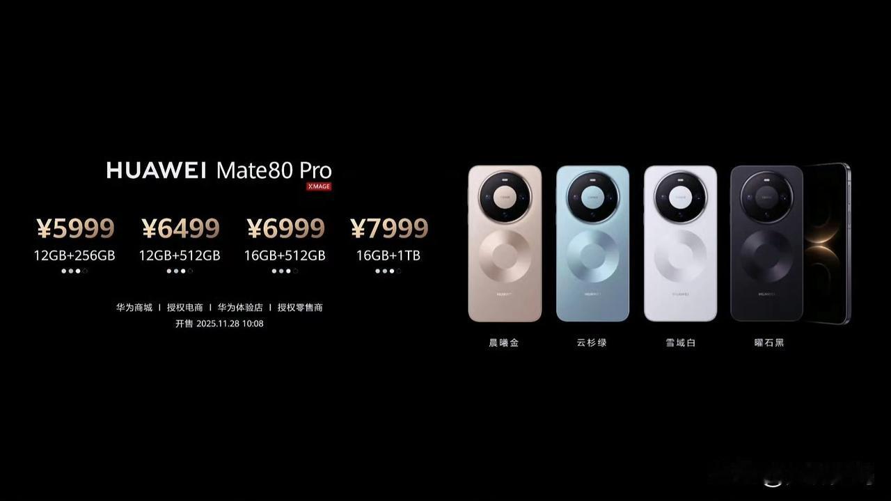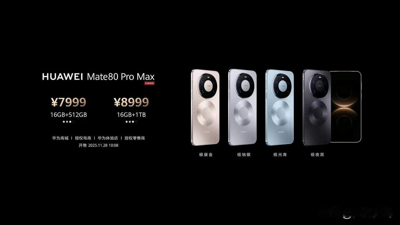 华为Mate80系列价格出来了,标准版对比上一代增配的同时还降价了! 个人感觉,标准版和ProMax应该会卖得不错,不信我们看价格: 华为Mate80: 12GB+256GB——4699元 12GB+512GB——5199元 16GB+512GB——5499元 华为Mate80 Pro: 12GB+256GB——5999元 12GB+512GB——6499元 16GB+512GB——6999元 16GB+1TB——7999元 华为Mate80 Pro Max: 16GB+512GB——7999元 16GB+1TB——8999元 华为Mate80 RS: 20GB+512GB——11999元 20GB+1TB——12999元