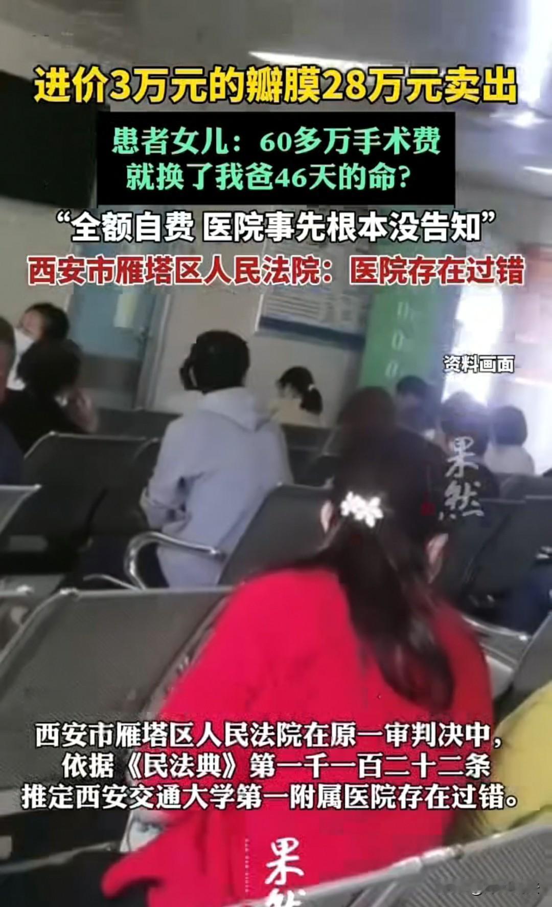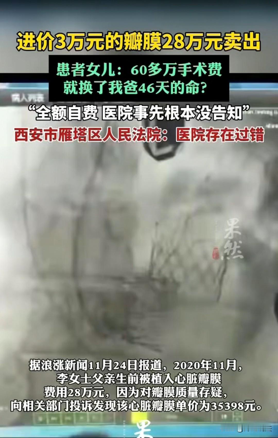西安,72岁的李大爷查出主动脉瓣中度狭窄,医生建议他做微创手术,术前预估费用10万元。可最终手术总花费高达61万元,其中仅心脏瓣膜一项就收费28万元,且这笔费用为全自费项目,医院术前并未告知李大爷及其家属。更让家属痛心的是,李大爷术后仅存活了46天便离世。李大爷的女儿李女士怀疑心脏瓣膜存在质量问题,于是发起投诉。经核查发现,该心脏瓣膜的实际单价仅为35398元(含配套介入器合计37926元),且医院的账单中还存在多项子虚乌有的收费项目。 李大爷今年72岁,最近频繁头晕,便去医院检查,才查出主动脉瓣中度狭窄。 医生告知他:你这个病情如果不干预,容易发生猝死。李大爷身边有过类似病患的案例,心里十分害怕,连忙追问该如何干预,让医生详细说明。 医生告诉他,最好的办法是植入心脏瓣膜。李大爷一听是大手术,担心费用过高自己承受不起,连忙问:这手术得花多少钱啊? 医生回复他:费用不算贵,大概只需10万元,你可以和儿女们商量下,决定要不要做。 李大爷的女儿李女士得知价格后,觉得可以接受,心想如果能报销一部分,几万块就能解决,还能让父亲安心,便同意了手术。 随后,李女士在手术同意书上签了字,也确认了这是一台微创手术,对父亲身体伤害不大。 可手术过程中,医院未提前告知家属,擅自将微创手术改为开胸手术,术后结算时,不仅开胸手术费用照收,原本计划的微创手术相关费用也未取消,相当于两项手术费用都进行了收取,这也让总费用大幅攀升至61万元。 更让李女士难以接受的是,父亲原本只是头晕,并未到病危程度,做完手术后却仅存活了46天,最终因多器官衰竭离世。 李女士怀疑是植入的心脏瓣膜存在问题,于是发起投诉。这一投诉才发现,心脏瓣膜的收费高达28万元,而其实际单价仅为35398元(含配套介入器合计37926元)。 她此前还纳闷,这么高的费用,瓣膜质量却如此不靠谱,原来实际价值仅3万多元。 关键是,当初医生并未告知她这笔瓣膜费用是全自费项目。李女士表示,若是早知道这是国产瓣膜且需全自费,价格还这么高,她肯定不会选择这一款。 李女士认为医院存在诸多隐瞒,甚至有欺骗嫌疑,除了瓣膜费用问题、微创改开胸却双向收费外,账单中还有其他多处异常:比如父亲术后一直卧床,账单上却有34次会阴清洗费; 账单显示收取了96次血气分析费,但她拿到的对应单据只有50张,相差46次;此外,还有1.5万元的虚构单据,对应的医疗服务根本没有发生。 李女士气愤地说:他们这难道是想骗保吗?父亲没救回来,还花了这么多冤枉钱,光心脏瓣膜就收了28万,实际单价才3万多,差额太大了; 说好的微创改成开胸,两项费用还都收,这根本就是不合理收费。他们不告诉家属实情,隐瞒瓣膜全自费的情况,就是欺骗。 而且七七八八算下来医药费高达61万,这根本不是普通家庭能承受的,还列出这些莫名其妙的账单,实在让人瞠目结舌。 后续经核查,医院存在26项医保违规操作,其中就包括微创改开胸双向收费、虚构护理及检查项目收费等问题,医保部门已追回7.5万元违规费用;李女士因举报有功,获得2000元左右的奖励。 对于这起医疗纠纷,一审法院判决医院存在严重违规,需承担70%的责任,赔偿李女士共计69万元。 医院对此判决不服,辩称李女士已签字认可手术相关事宜,手术本身存在风险,且李大爷已72岁,出现意外属于正常可能性,不应让医院承担70%的责任。 李女士同样不认可该判决,她质疑:医院承担70%,意味着我们要承担30%,这30%的责任凭什么算在我们头上? 我们哪里错了?是我们没了解清楚情况吗?我们作为老百姓,既不专业,也没有获取专业信息的渠道,根本无法全面知晓医疗细节,更何况医院还擅自改术式、双向收费、隐瞒自费项目,凭什么让我们承担30%的责任? 目前,二审法院已将案件发回一审法院,要求重新审理宣判。 一、术前医院预估费用10万元,最终实际花费达61万元,其中28万元心脏瓣膜为全自费项目,医生未提前明确告知,且该瓣膜实际单价仅35398元,医院存在虚报价格、隐瞒关键费用信息的问题。 《民法典》第一千二百一十九条:医务人员在诊疗活动中应当向患者说明病情和医疗措施; 医院未告知瓣膜全自费属性及真实价格,违反法定说明义务,剥夺患者选择权,造成经济损失,需担责并退还差价。 二、李大爷术后仅存活46天,其多器官衰竭离世的损害结果,与院方擅自更改术式、诊疗操作不规范等违规行为存在直接因果关系,院方应承担医疗损害侵权责任。 《民法典》第一千二百一十八条:患者在诊疗活动中受到损害,医疗机构或者其医务人员有过错的,由医疗机构承担赔偿责任。 院方诊疗存在过错,且过错与李大爷死亡结果直接相关,符合医疗损害责任构成要件,应依法赔付。 大家如何看此事? 素材来源于:浪潮新闻2025年11月25日