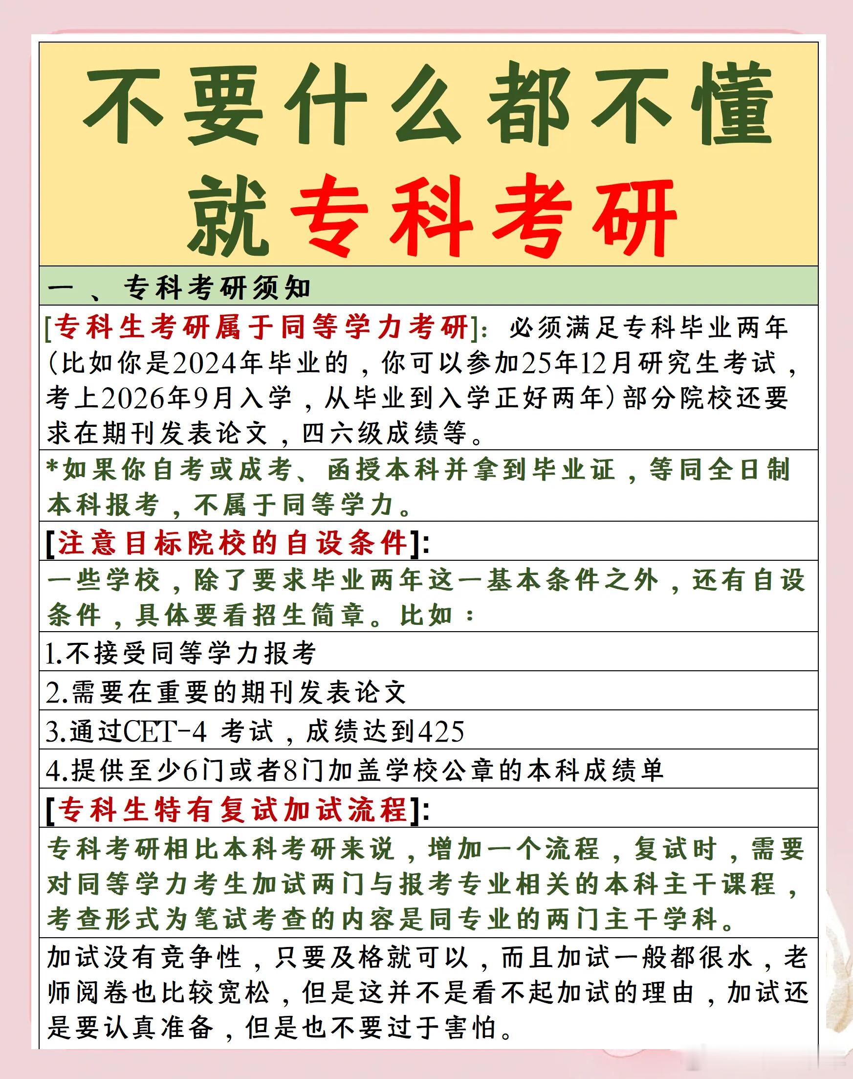 专科考研的前提是:需要毕业满两年或两年以上达到同等学力,符合报考要求才能报名。同等学力考生。它和本科生的区别是在于复试过程中的加试,其次就是部分高校真的不要专科生。专科生想在研究生招生考试中,要想让自己不被定义,可以去升本,不管你以什么手段获取本科学历,你就是本科生,你就不用担心择校问题。总之一句话:专科生考研,并非不可能,但难度非常大。