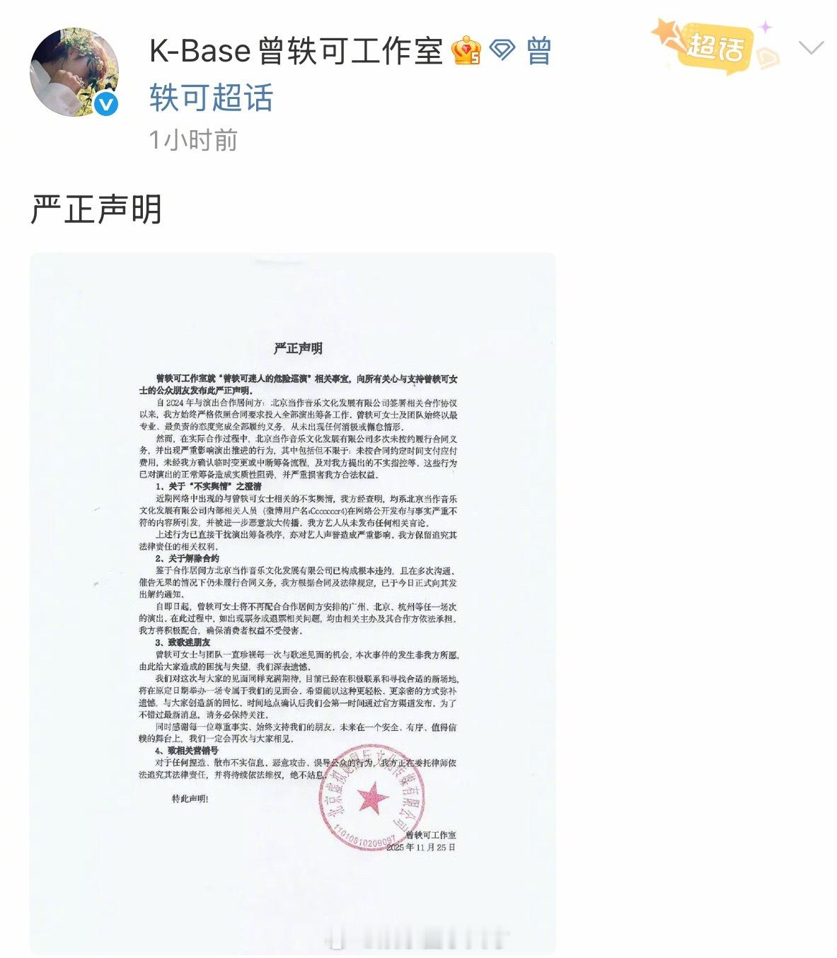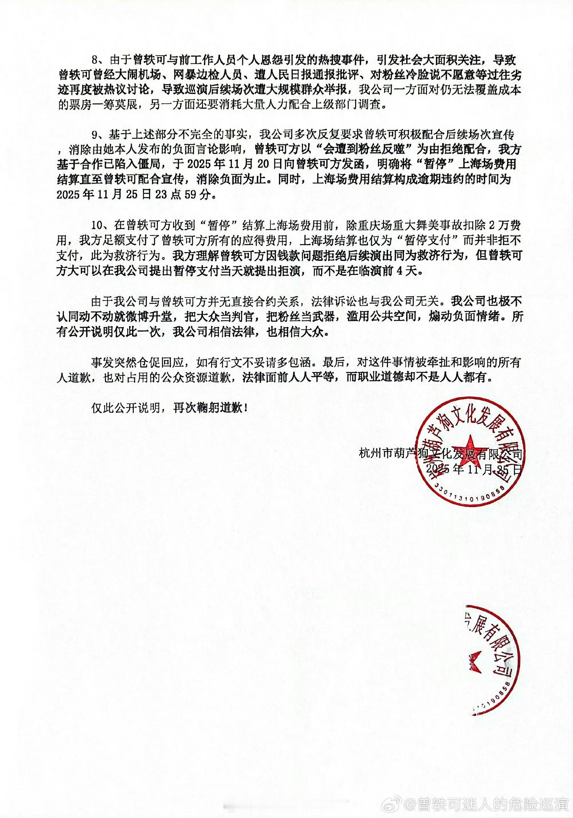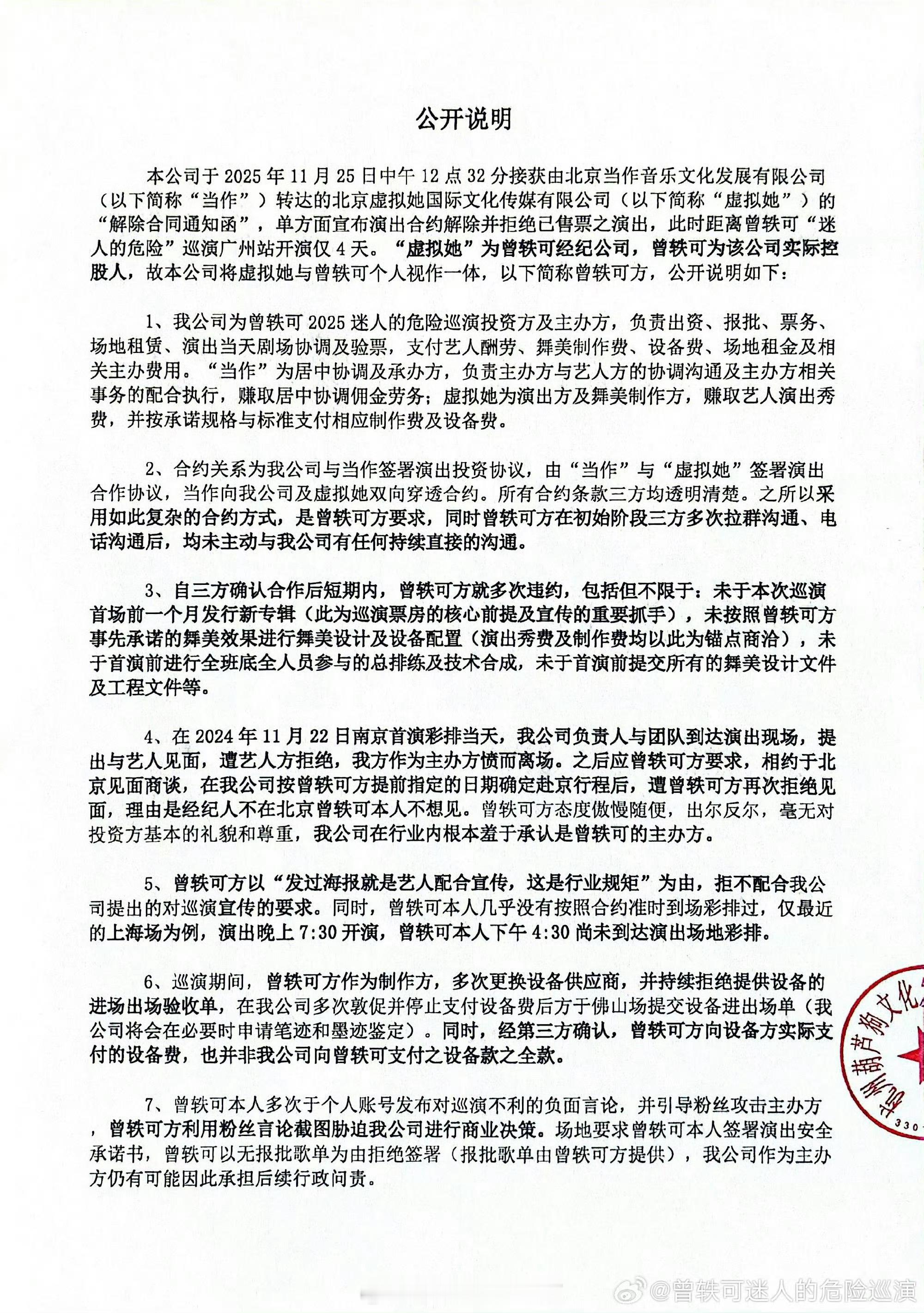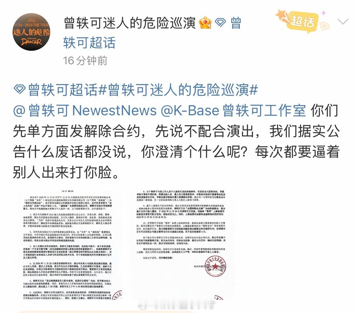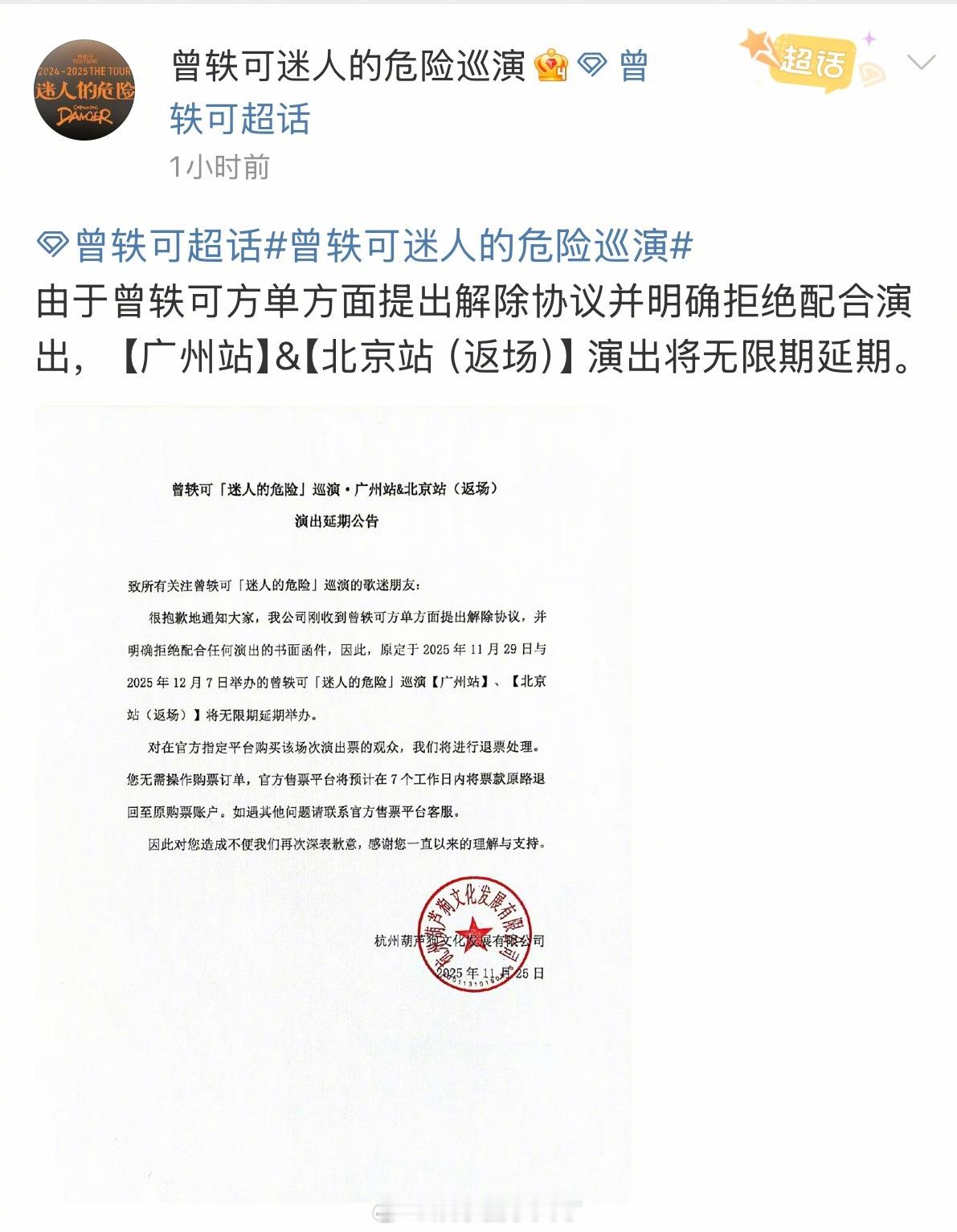 曾轶可迷人的危险巡演主办方发文称巡演将无限期延期!(图一)曾轶可工作室发文称在合作过程中主办方未按合同履行义务,严重影响演出的推进(图二图三)主办方再发文称是曾轶可单方面解约,说曾轶可在合作期内多次违约,不配合宣传,多次更换供应商设备等(图四五六)