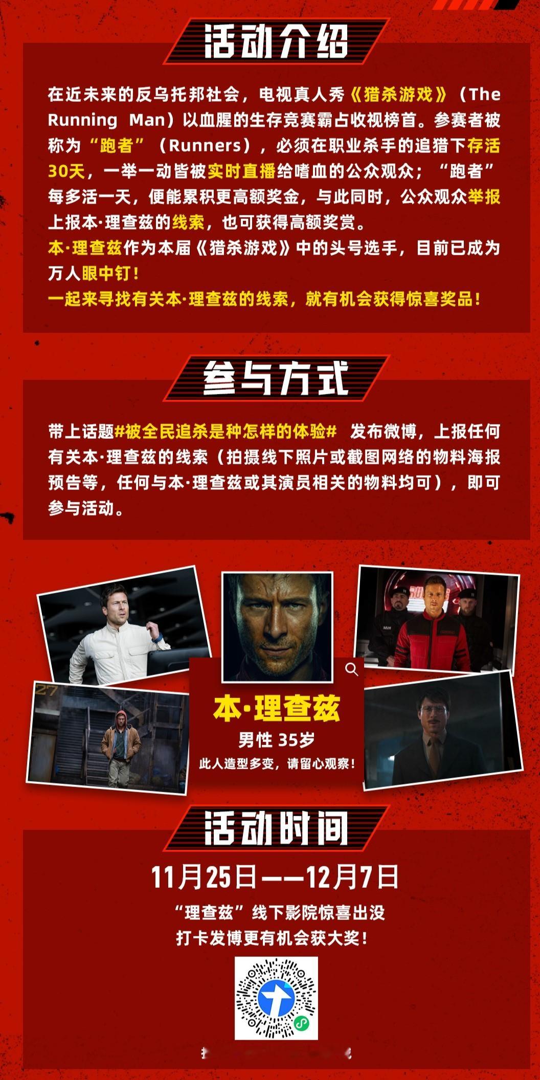 电影《猎杀游戏》的大逃杀走进现实!这下真的能全民猎杀理查兹了!官方发起了一个“上报理查兹线索得惊喜大奖”的线上线下打卡活动,即日起去全国线下500家影院打卡上传理查兹的“行踪”,就有机会得奖品!同时线上也可以直接参与活动 ,一起猎杀理查兹!一起开启现实版“猎杀游戏”!