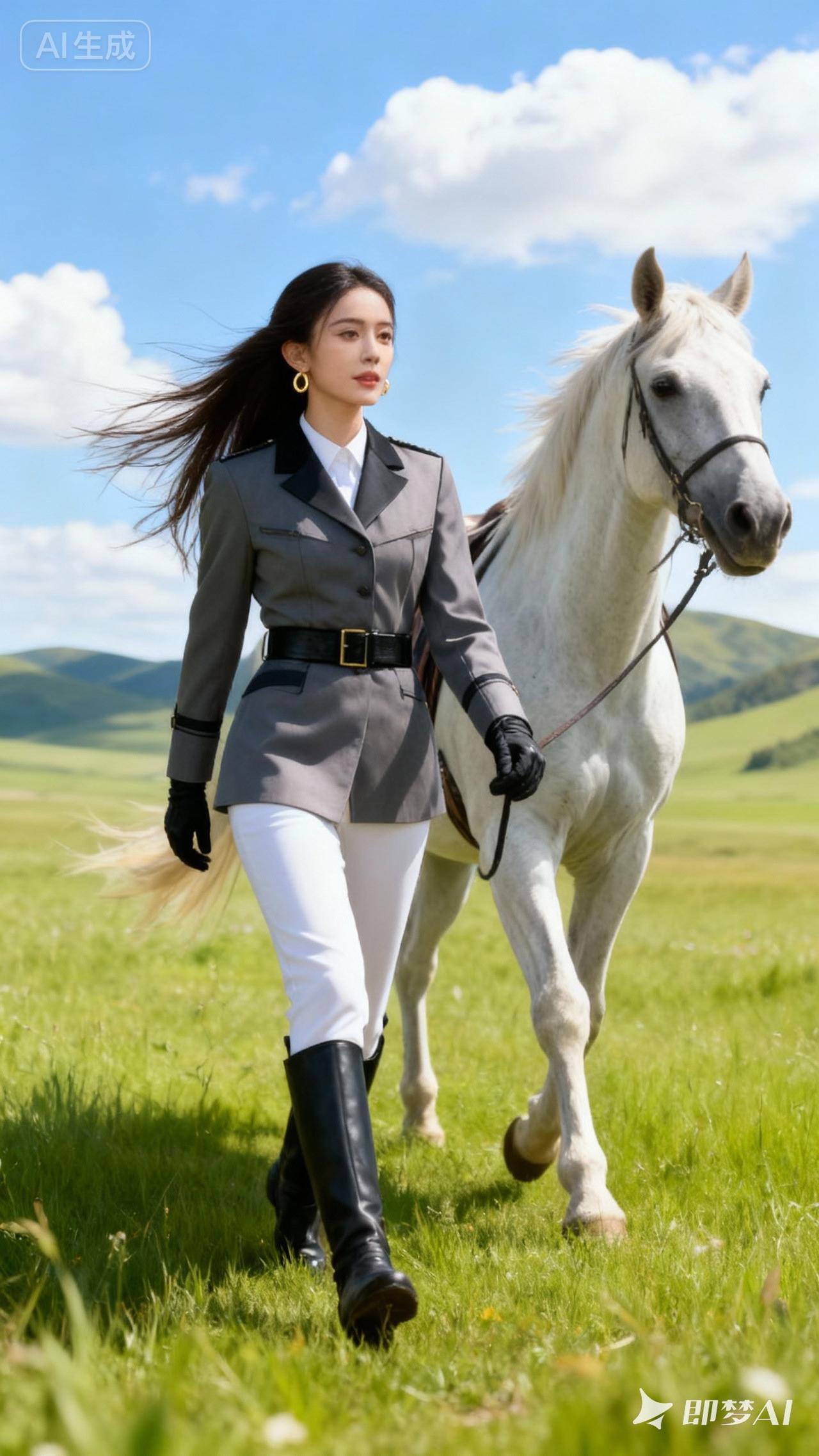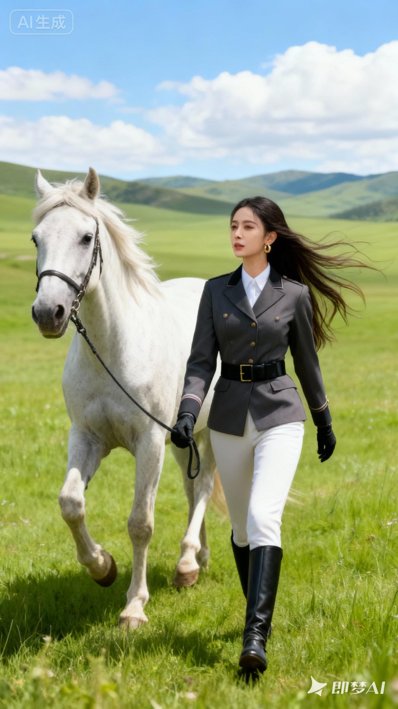 英姿飒爽的骑警与白马并行,草原上的风华绝代。