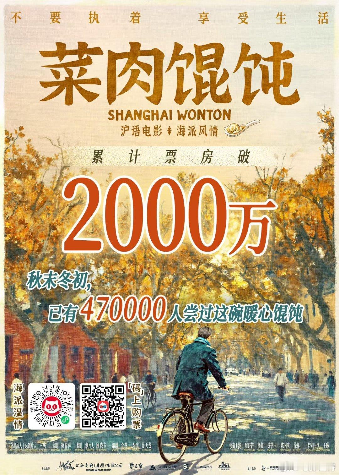 《菜肉馄饨》票房破2000万,这片子江浙沪区域上映这两天尝试扩映在北京部分城市上映。今年潮语电影《夏雨来》沪语电影《菜肉馄饨》都破两千万票房。上海广东都是票房重镇这两部都是接地气的情怀电影。