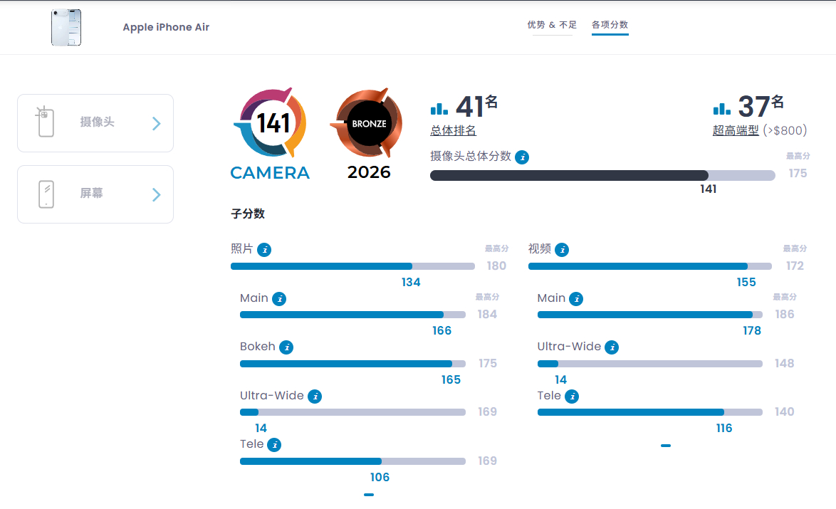 苹果iPhone Air影像DXOMARK获 141 分,位列全球第 41 名