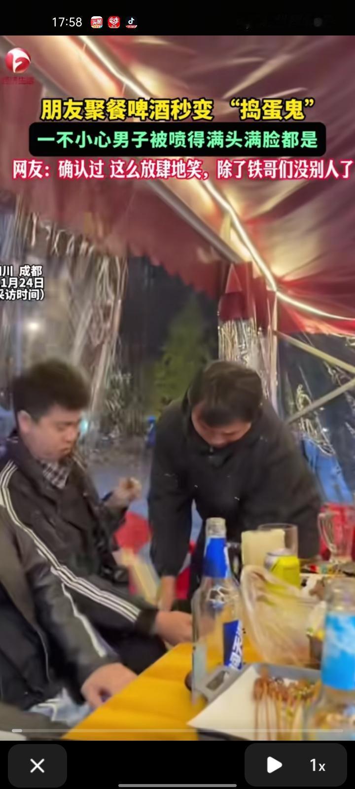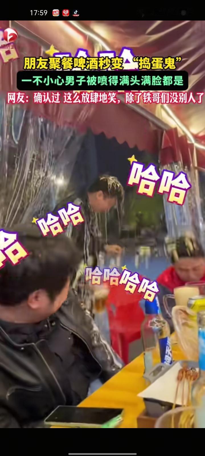 11月23日,四川成都。男子与朋友们聚餐,啤酒秒变“捣蛋鬼”,朋友倒啤酒时手滑把男子喷的满脸都是,事后朋友们在放肆的欢笑,完全承包了所有人的笑点。