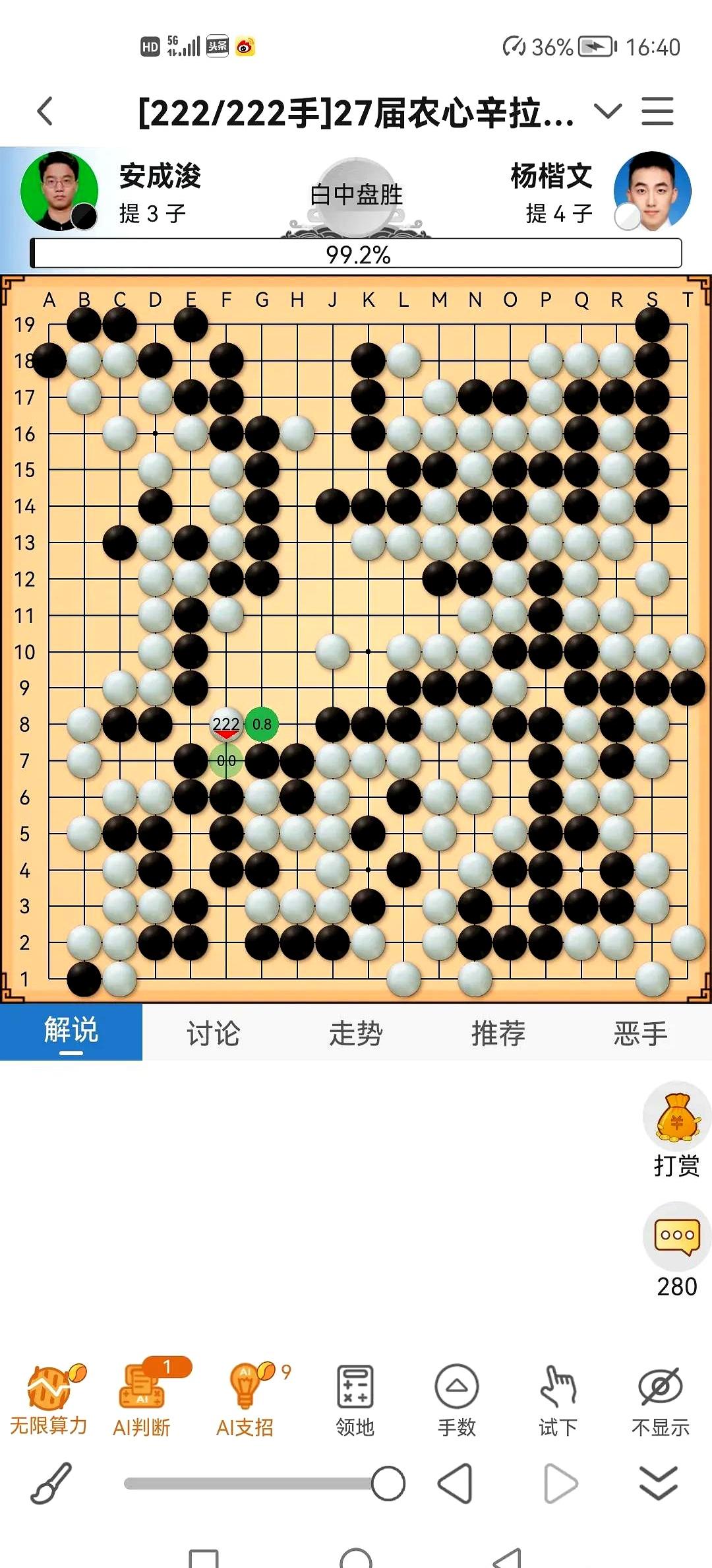 杨楷文又赢了,农心杯二连胜!韩国棋手安成浚被他中盘拿下,全程几乎没给对手机会,这叫完胜。 竞技体育就得这么干脆,光赢不够,还得赢得让对手心服口服。这就像打比赛,你不能总指望最后几秒绝杀,过程中的压制力才是实力的真正体现。 现在压力给到日本队了。下一个上场的是一力辽吗?不管是谁,杨楷文这股劲儿必须保持住,继续往前冲!