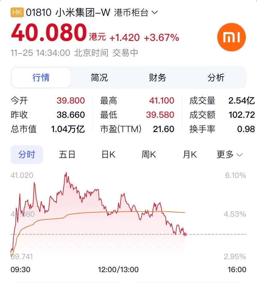 我刷到小米股价涨4.5%还挺惊喜的,毕竟之前连跌六周确实看得揪心,雷军自掏1亿增持+公司回购护盘,总算稳住了节奏👏作为用过红米手机和小米家电的普通用户,我其实知道三季度财报不算差,汽车首季盈利、营收利润都涨了,就是之前的安全争议和购置税退坡消息太影响信心。不过现在小米在跟进安全整改,成立专项小组查问题、优化智驾,后续整改落地应该能慢慢重建信任,毕竟产品靠谱才是根本。担心芯片涨价和购置税增加的朋友,其实也不用太慌。小米高端机占比越来越高,抗成本能力强,而且行业里不少品牌都在做购置税兜底,说不定小米也会跟进,对冲成本压力。加上恒科指12月调权要提高小米权重,被动资金会进来,南向资金也连续买了6天,资金面有支撑。目前36港元附近算是稳住关键点位,后续就看小米9上市、新工厂投产能不能跟上,年交付目标达成了估值大概率能修复。我期待小米越来越好,希望能踏踏实实做好产品,稳住质量和产能,后续能继续交出亮眼成绩,小米集团股价也能稳步往上走~