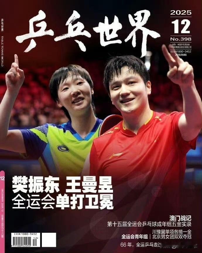 荣耀彼此:樊振东王曼昱“同登”杂志封面! 樊振东,第十五届全运会男子单打冠军,蝉联 2 届金牌。 王曼昱,第十五届全运会女子单打冠军,蝉联 2 届金牌。 都是蝉联,都是单打金牌,这两人都扭到一块了,再次祝贺小胖,祝贺曼昱! 4 年后再来一次,那就真的更牛了🤙