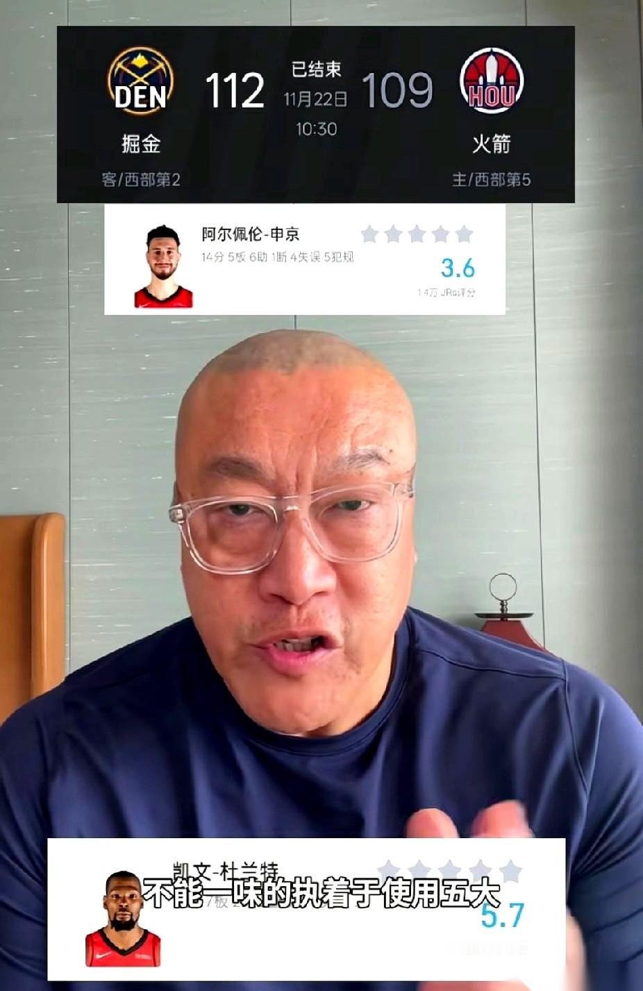 别再跟我提什么“五大阵容”了,我听得脑仁儿疼。 这玩意儿就跟大力丸似的,以为能包治百病? 你瞅瞅对面掘金,首发五个人,哪个胳膊上没挂着瞄准镜?人人都能投。我们倒好,场上摆五个大汉,其中一个还没外线技能包,人家防守直接笑嘻嘻地收缩,把篮下堵得跟早高峰地铁似的。 申京在里头转个身都费劲。 直到那个替补小伙子上来,唰唰唰几下,把空间撕开了。 看见没?篮球有时候就这么简单,也这么残酷。你有一个短板,人家就照着你这个短板往死里打。 当然了,把锅全甩给战术也不公平。 今天当家的那几个,打的是个啥啊? 一个13分,一个14分。 哥们儿,这是你们的正常水平吗?说难听点,这数据,你去跟底薪球员换,人家可能都嫌寒碜。 球星之所以是球星,不就是在这种硬仗里站出来的吗? 结果呢,集体梦游。 所以输了,真的一点不冤。 战术被克制,球星又不在线,神仙也救不了。 唉。 算了,磨合吧。 还能说啥呢,就当是交学费了。
