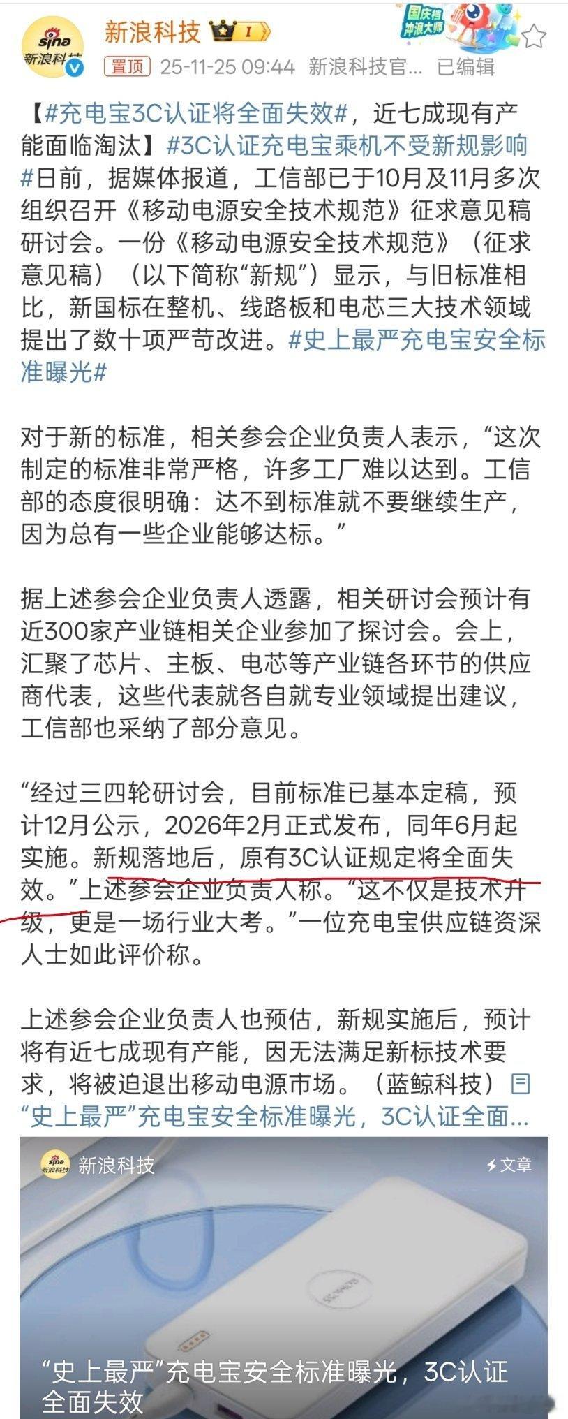 充电宝将迎来一次大的改革, 新的充电宝安全标准落实后,原有3C认证规定将会失效。同时预计将会七成现有产能,因无法满足技术需求,退出移动电源市场。
