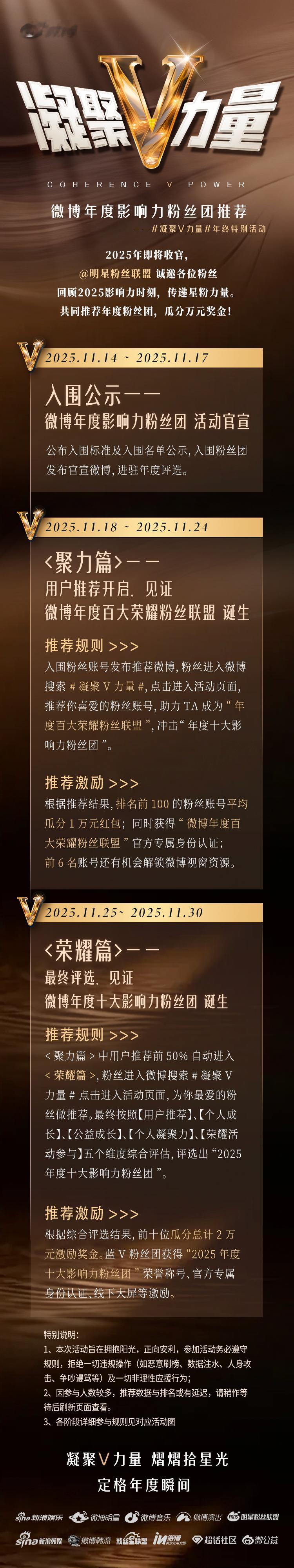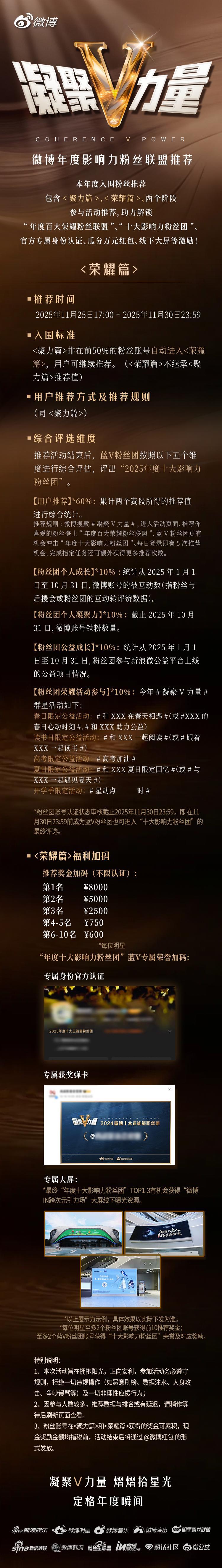 发起的年终特别活动 【荣耀篇】阶段正式开启! 👑 年度十大荣耀冲刺揭幕,一起为热爱全力以赴,共同见证年度最具影响力粉丝团诞生!📣推荐入口:微博【年度十大影响力粉丝团】评选(11月25日17:00正式开启)⏰推荐时间:荣耀篇:2025年11月25日 17:00 - 2025年11月30日 23:59✍🏻推荐规则:1⃣️在微博搜索 或 进入活动页,每天拥有5次推荐机会,完成任务可获得额外次数(推荐机会仅当日有效)。2⃣️【聚力篇】中排名前50%的粉丝团将自动入围【荣耀篇】,粉丝可继续推荐心仪粉丝团。最终将基于【用户推荐*60%】(累计两个赛段所得的推荐值进行综合统计)、【粉丝团个人成长*10%】、【粉丝团个人凝聚力*10%】、【粉丝团公益成长*10%】、【粉丝团荣耀活动参与*10%】五大维度综合评估,评选出年度TOP10蓝V粉丝团账号为【2025年度十大影响力粉丝团】⚠️【荣耀篇】不继承【聚力篇】推荐值⭐️推荐激励:【荣耀篇】惊喜福利加码🎁荣耀篇前十粉丝团瓜分💰2万元推荐奖金池(税前);年度十大影响力蓝V粉丝团还将获得专属身份官方认证、获奖专属弹卡等荣誉加持,还有线下大屏资源曝光等多重奖励,为年度荣耀全面加冕!💡活动须知:1、本次活动旨在拥抱阳光,正向安利,参加活动请务必遵守活动规则,拒绝违规操作(如恶意刷榜、数据注水、人身攻击、争吵谩骂等)一切非理性应援行为;2、因参与人数过多,用户推荐页面显示推荐次数和排序更新可能会有几分钟缓存更新,请耐心等待几分钟后重新进入页面查看;3、各阶段详细参与规则详见对应活动图。4、粉丝账号在和获得的奖金可累积。现金奖励均指税前,活动结束后将通过 的形式发放。年度荣耀冲刺已开启!参与活动推荐,为你心仪的粉丝团点亮最高荣誉👇🏻
