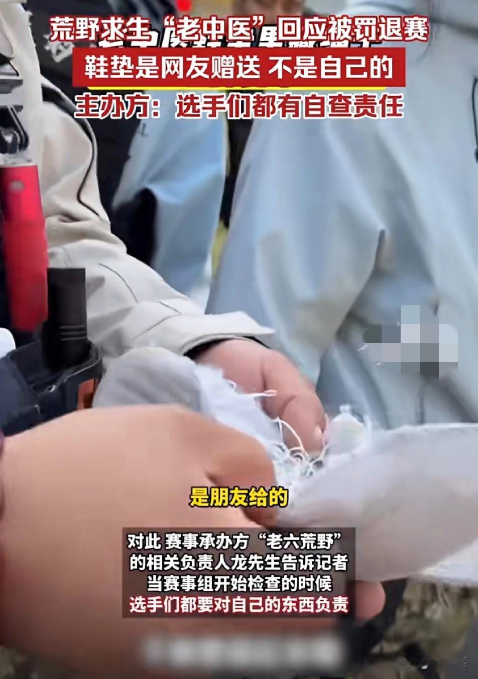 绷不住了 荒野赛选手“老中医”带的鞋垫里藏了违规绳具,直接被退赛 他开直播喊冤 说鞋垫是网友送的,自己根本没查 可主办方一句话堵死:“选手得对自己带的东西负责” 不知情真能当借口吗 极限赛事的规则红线,到底该给“无心之失”留余地吗 毕竟赛场公平是底线,但选手的“不知情”,又算不算另一种“疏忽之过”