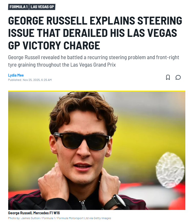 拉塞尔表示在整场拉斯维加斯大奖赛正赛中,他持续遭遇转向系统反复故障以及右前轮胎粒化问题。“大约第五圈时转向问题再次出现,和排位赛时一模一样。我设法在这种情况下驾驶,逐渐习惯了应对这个挑战,而且第一段的速度看起来相当不错。”“但当我第二次进站后,维斯塔潘从维修区出来时,我正打算发动攻击争取领先位置,结果右前轮出现颗粒化磨损。我告诉车队‘我觉得这条轮胎撑不到终点了’,但他们考虑到差距,有信心完赛。”“但每一圈都太痛苦了。我的圈速越来越慢,越来越慢,我当时就想‘这太糟心了’。第三名已是极限,除第一圈外整场比赛毫无乐趣可言。”