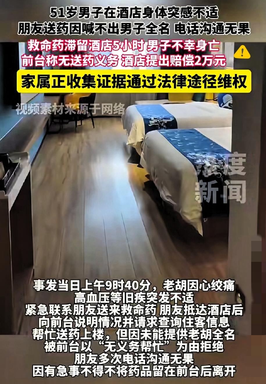 “一句‘没义务’,害死一条命!武汉这起悲剧真的让人脊背发凉!” 51岁男子独自住酒店突发不适,托朋友送救命药到前台,却被以“无义务”为由拒绝送达,直到5小时后查房才发现男子已不幸身亡。 酒店总说“无送药义务”,但法律明确规定,经营场所对消费者有安全保障义务,这可不是一句“没义务”就能推脱的。 朋友都明说客人身体不适,药品就摆在前台,哪怕多走一步核实房间、多打一个电话提醒,都可能挽回生命。 所谓的“按流程办事”,在人命面前根本站不住脚。 服务行业的底线从不是死板守规矩,而是守住人情味和责任心。 少一点冷漠的“免责”,多一点主动的“多做一步”,或许就不会有这样的遗憾。 你觉得酒店该担多大责任?来评论区聊聊~