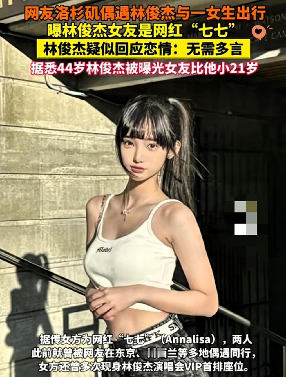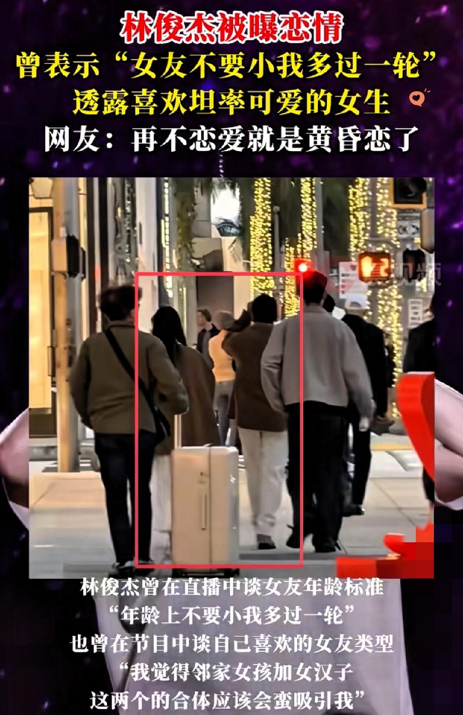 “林俊杰被曝恋23岁网红!” 44岁的他被拍到和叫“七七”的女孩穿情侣装逛街,女方是家境优渥的设计系千金,早就在他演唱会VIP席蹲了半年。 总有人揪着20岁年龄差骂,可谁规定爱情得按年龄卡尺寸? 他以前追白月光追得轰轰烈烈,现在选个低调懂他的女孩,反而是活明白了——爱情哪是“找理想型”,是遇到能让自己松弛的人。 粉丝急着脱粉,可他本就不是谁的“纯情挂件”,44岁想谈场不被围观的恋爱,太正常了。 真喜欢他,该盼他有热饭吃、有人等,而不是把他焊在“单身情歌王子”的标签里。 你觉得明星恋爱该被年龄绑架吗?来聊聊你的看法~