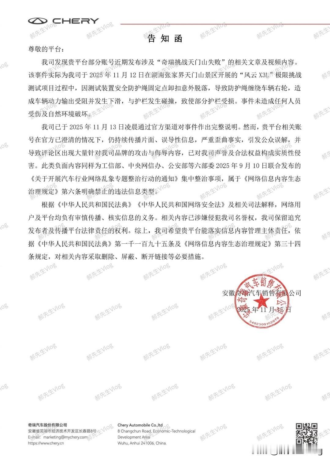 被奇瑞汽车投诉了,说我侵权? 真是搞笑,我只是发了个视频询问挑战天门山失败,这是什么汽车?又没提过汽车品牌,侵犯你奇瑞什么权利了! 梁静茹给你的勇气,让你公然在国家地质公园里开车挑战天门山天梯?如果挑战成功了,你恨不得所有网友都疯传你们的视频。现在挑战失败,你感觉丢脸了,你举办我视频,有胆做,没脸让我网友看笑话了! 这么大的企业,表面上承认错误道歉,背地里却干着见不得人的事,偷摸举报网友拍摄的挑战失败的视频。有胆做,那么什么结果你都应该受着,你们奇瑞的底气呢? 马斯克SpaceX星舰飞船多次发射失败坠毁,也没见马斯克全网投诉网友下架飞船失败的视频。这就是马斯克的底气,成功鼓掌,失败自己受着。 只想网友看到自己牛B的一面,害怕自己的失败和无能让网友看见,还投诉网友视频,真是无耻!奇瑞挑战天门山