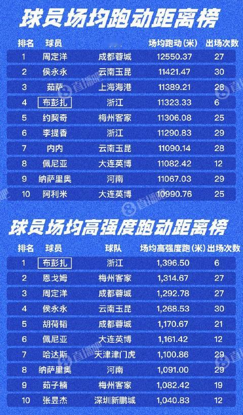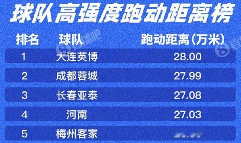几个与大连英博有关的数据。吕焯毅入选最佳阵容,在抢断、拦截等数据方面表现出色。大连英博的跑动数据非常不错,这也是球队立足中超的关键!