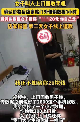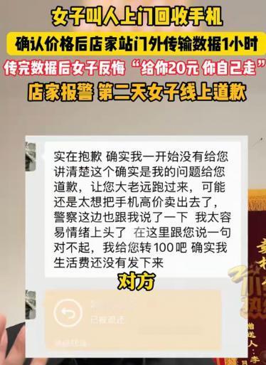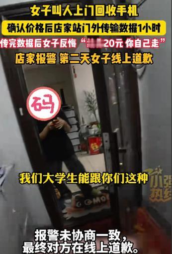 据11月18日报道,新疆一女子叫人上门回收手机,二人说好价格2800元,店家在门外传输数据1小时,传完后,女子突然说:不想卖了,手机还我。店家气够呛,让女子支付200元上门费,女子却说:给你20块钱,你自己走。店家被激怒:你拿我当狗溜着呢!谁给你惯出来的毛病?女子来一句:我们大学生能跟你们这种二道贩子一样?店家气到报警,接下来的事情让女子啪啪打脸。 今年11月中旬,在乌鲁木齐做二手手机生意的小张,接到了一个女大学生的单子。女生想把自己的旧手机卖掉,还和小张商量着置换新设备,双方在网上沟通得很顺畅。 当场敲定旧手机的回收价是2800元,小张还答应会准备好配套的手机壳和膜,一切都谈得明明白白。 16号下午,小张带着助手如约上门,可刚一见面,女生就说自己不在他这买新手机了,已经在别处选了更便宜的。 买卖自由,小张虽然有点无奈,但想着既然来了,把旧手机按约定的2800元收了也成,没多想就答应了。 可他没料到,女生“耍人”即将开始。 核验完旧手机的情况,正准备结账收货,女生又提出要求,让小张先把旧手机里的资料全部导到她刚买的新手机里。 小张看着对方是学生,又是女生,觉得这点忙也不算什么,就答应了下来。 接下来的一个小时,成了让小张难忘的经历:他和助手捧着手机在阴冷的楼道里做数据迁移,站得腿都发酸,而女生却关上大门,把他们晾在门外,全程没有一句招呼,仿佛他俩只是等待召见的随从。 好不容易等数据条走到100%,小张敲开了门,没等来一句感谢,反而听到了让他难以置信的话:“不想卖了,手机还我。” 之前谈好的2800元回收价,仿佛从来没存在过,女生轻飘飘的一句话,就推翻了所有约定。 小张瞬间懵了,一个小时的寒风白吹了,辛苦导数据的功夫也白费了。他压着火气和女生理论,可对方却理直气壮,完全无视之前的约定。 既然生意做不成,小张提出让女生支付200元的上门费和技术服务费,毕竟两个人跑了一下午,还花了一个小时处理数据,这个要求合情合理。 可女生的回应彻底点燃了小张的怒火,她不仅鄙夷地说不可能给200元,还掏出20块钱,那副打发叫花子的姿态,让人难以接受。 小张气得当场质问:“你拿我当狗溜着呢!谁给你惯出来的毛病?”没想到女生却抛出了更离谱的话:“我们大学生能跟你们这种二道贩子一样?” 在她眼里,自己的学历好像赋予了她高人一等的特权,而靠手艺和辛苦吃饭的小张,就低人一等。 争执之下,女生竟然先报了警,还谎称小张“抢手机”“骂人”。到了警察面前,她又哭哭啼啼博取同情,坚持认为自己没错,甚至拒绝道歉。 最后,小张只能无奈认栽离开,心里憋屈的不是那点钱,而是被肆意践踏的尊严和诚信。 本以为事情就这么过去了,可没想到,事发后的第二天(18号),剧情出现了反转。那位之前不可一世的女大学生,通过客服渠道找到了小张,语气终于软了下来。 她承认自己是因为生活费紧张,想多卖点钱才临时变卦,一时情绪失控口出恶言,还转来了100元作为辛苦费,诚恳地道歉认错。 今年35岁的小张,在社会上摸爬滚打多年,看到女生的道歉信,心里的气也就消了大半。他没有收下那100元,而是退了回去。 对小张来说,他在乎的从来不是这百十来块钱,而是一个理字,一份尊重。既然对方已经认识到错误并道歉,他也没必要跟一个还没真正踏入社会的学生穷追猛打。 这场发生在乌鲁木齐楼道里的风波,最后以和解收尾,但留下的思考却值得让人回味。“大学生”这个身份,本该是知书达理、诚信守诺的象征,而不是傲慢无礼的遮羞布。 那位女生随口贬低他人的话语,其实是在透支整个大学生群体的信誉;而被她瞧不上的店主,最后用退回100元的举动,给这个尚未成熟的灵魂上了生动的一课。 尊重是相互的,无论学历高低、职业不同,每个人都值得被平等对待,诚信更是为人处世的基本准则。