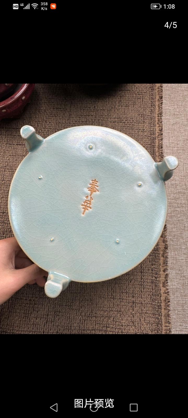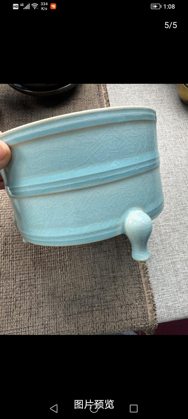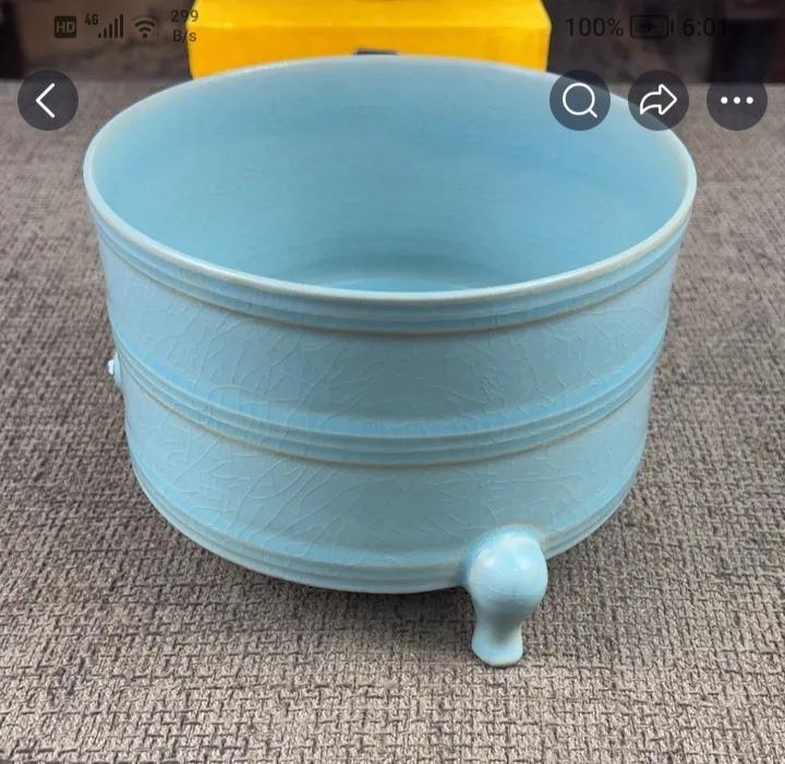 真正的北宋汝瓷是什么样呢? 真正的北宋汝瓷,那可是瓷器界的王者。它位居宋代“汝、官、哥、钧、定”五大名窑之首,有“汝窑为魁”之称。 汝瓷造型古朴大方,多仿青铜器和玉器,像出戟尊、玉壶春瓶等。它以名贵玛瑙为釉,釉色以天青为主,有“雨过天晴云破处”的绝美效果。釉面开片独特,有蝉翼纹、梨皮纹、蟹爪纹等,“蟹爪纹”开片似鱼鳞,斜着有折光率,美极了。 汝瓷胎是浅灰色,像香灰,且胎薄,还有胎和底同厚的工艺。尺寸大多不大,“钧汝不过尺,钧汝无大器”。难怪从古至今,汝瓷都视若珍宝,能与商彝周鼎比贵。