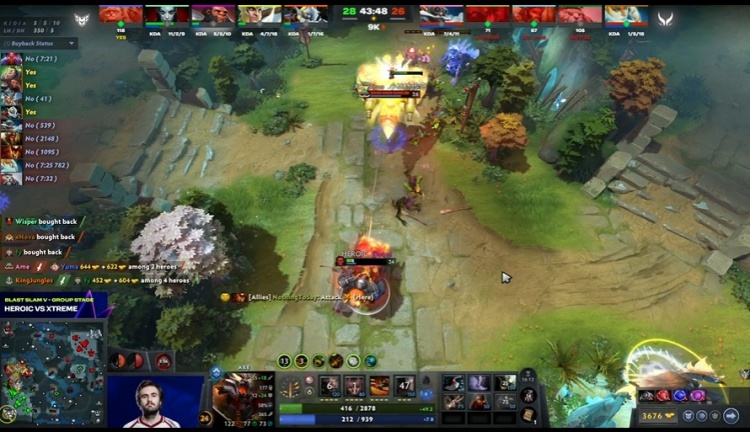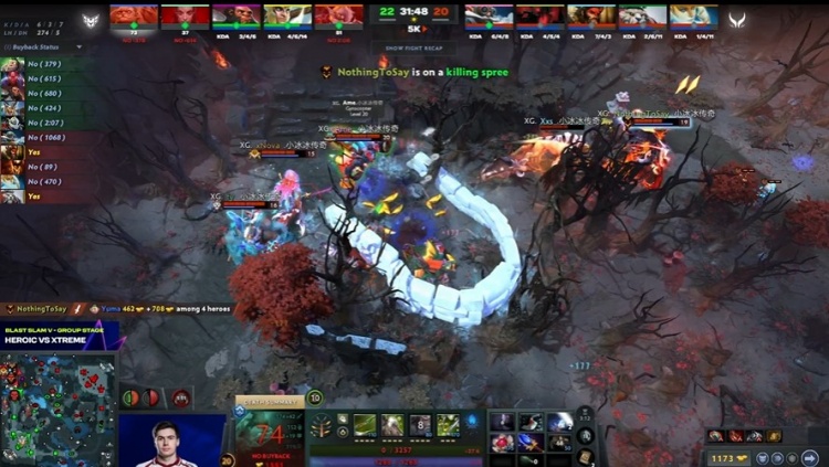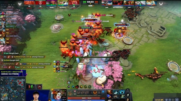 [23分钟]Heroic中路动手,xxs兽王中了毒镖,跳不出走不动被集火击杀,Ame飞机复活过来输出,但是脸上的Wisper痛苦女王有BKB,飞机输出没有完成击杀,最后是Heroic看技能用完撤退,Davai斧王撤退慢半步被四人包夹击杀。