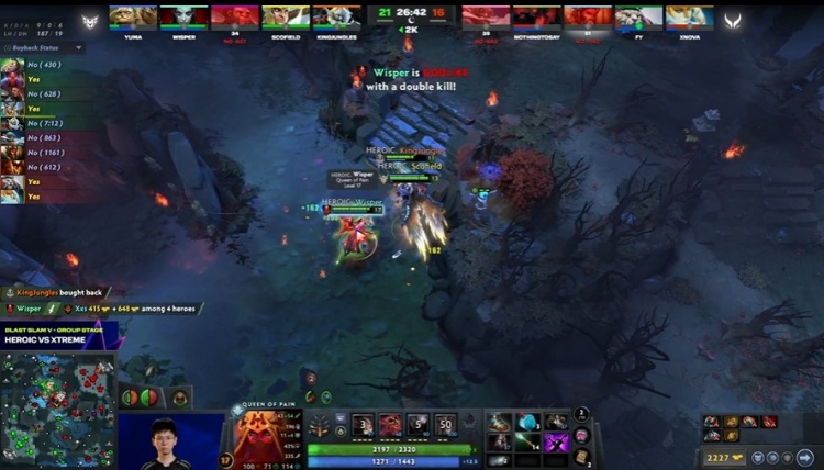 天辉Heroic:Davai斧王、Wisper痛苦女王、Scofield天怒法师、KingJungles发条技师、Yuma帕吉。