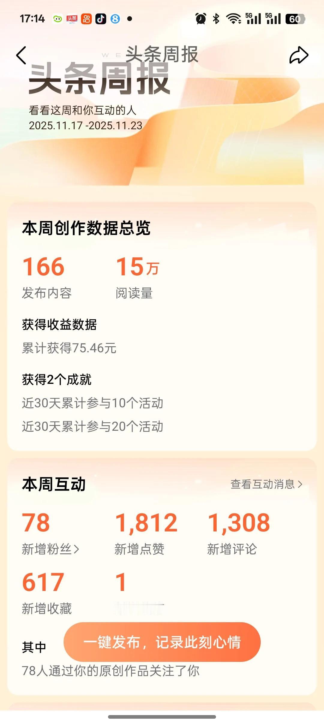 我被头条限流了,上周写了这么多东西,阅读量只有15万。 我发现写文章这个事儿啊,不能太急于求成,就应该按部就班的,有感想就写,没感想就拉倒,不要硬凑 我上周有好多都是硬凑出来的,所以导致看上去数量很多,但实际上质量不高,而且直接被限流了。 所带来最直接的影响就是以前文章很多消息都已经爆了,好多人评论,但是现在我所写的这些东西都只推荐给粉丝,所以很有可能我的粉丝数量还会下降,但是不知道这要持续多长时间,不管持续多长时间,我随便写着玩儿吧 这也算是我踩了一个坑,不知道什么时候能恢复正常,也许只有自己先写把质量搞上去才能再求别的吧 所以这个事情就慢慢的看吧,走一步看一步再说吧