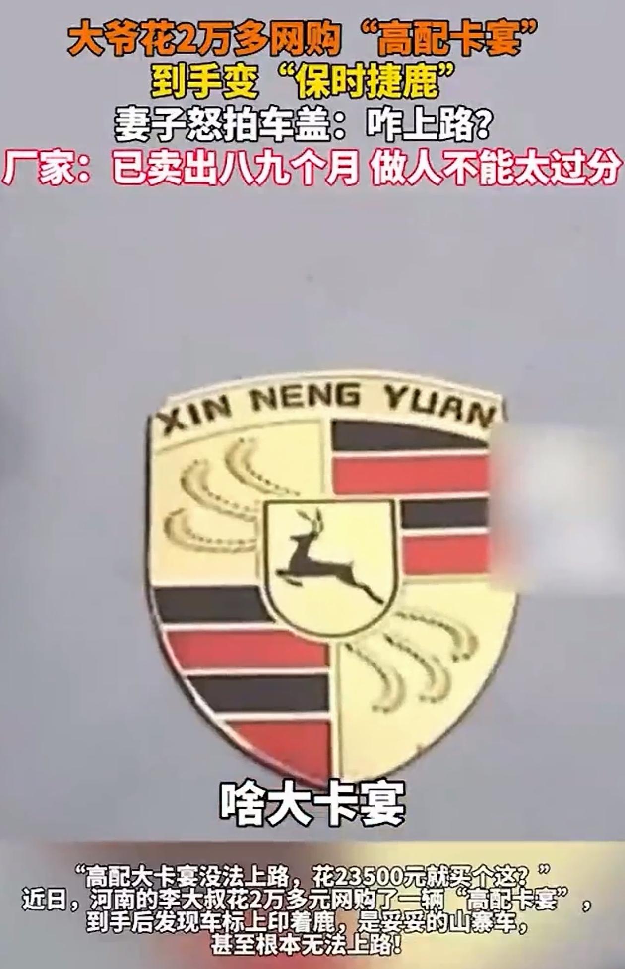 “贪小便宜吃大亏!”河南一大爷看到网上卖车,说2万多就能买个卡宴,他一心动就下单了,结果车子到手后一看,车标明明就是个“保时捷鹿”!网友:“用最少的钱买到了最顶的配置!” 河南的李大叔可算是上了回“豪华车”的当!前阵子他在网上瞅见个广告,说是“高配卡宴,只要两万多”,说是能上路、能拉货,顶配版还带真皮座椅呢! 李大叔一寻思,自己平时跑运输,正缺辆皮实耐造的车,立马就动了心。转账、下单、等发货,那叫一个心急火燎,就等着提车那天风风光光了。 车到那天,李大叔乐呵呵地拆开包装——嚯!这车头雕得跟保时捷卡宴似的,霸气侧漏啊!可凑近一瞧,车标上那“鹿头”愣是把人看懵了,李大叔纳闷啊,这保时捷咋还混进野生动物园了呢? 更扎心的是,这车压根开不上路!合格证上白纸黑字写着“非公路用车”,连个车牌都上不了。 李大叔媳妇儿当场就急了,一巴掌拍在车盖上:“咋上路?这玩意儿能上路我直播倒立洗头!” 更扎心的是,厂家那边甩锅甩得飞起:“车是老年代步车,能不能上路看当地政策!”李大叔气得直拍大腿:“我花的是卡宴的钱,你给我整个‘老年代步鹿’?做人不能太过分!” 卡宴正品少说也得七八十万,这网上两万多就能买“顶配”,搁谁谁不心动?可骗子就吃准了这点,专挑“低价高配”当诱饵。就像专家说的,这类山寨车往往用“老年代步车”的壳子,打擦边球卖高价,本质上就是合法抢劫! 再看厂家那态度:“车已卖出八九个月,退一赔三?想得美!”要我说,这哪是卖车,简直是卖“法律的空子”! 法律其实早就有规定,老年代步车不能上路,可厂家为啥还能明目张胆卖?说白了,监管的鞭子没打到痛点上,才让这些“李鬼”越来越猖獗。 说到底,这事儿给咱提了个醒:天上不会掉馅饼,便宜莫贪防吃亏!希望以后这种“山寨卡宴”少点,老百姓的腰包和脸面,可都伤不起啊!