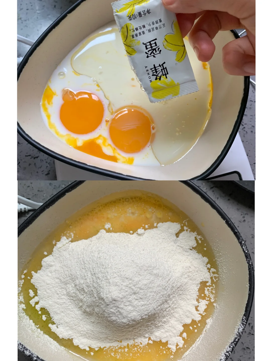 1️⃣蛋黄糊:蛋黄➕20g糖➕奶➕油搅均匀👉🏻筛入面粉,搅均匀·end