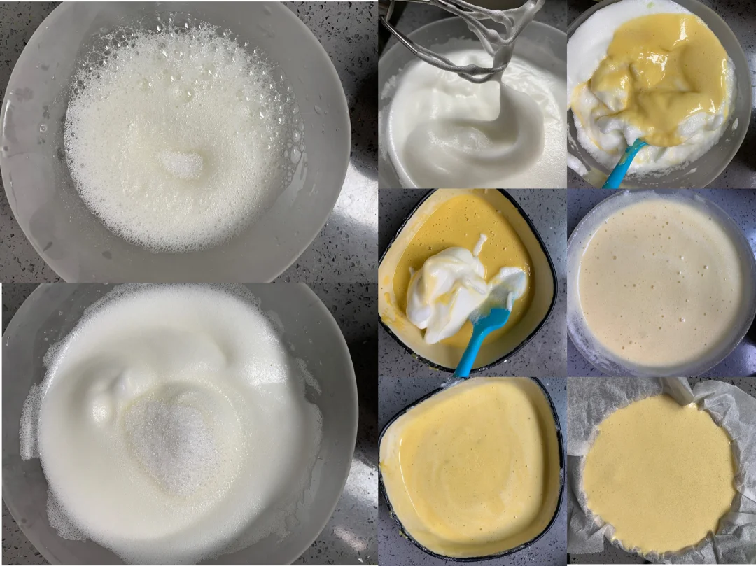 3️⃣蛋糕糊:1/3蛋白加入蛋黄糊,搅拌均匀👉🏻加入剩下的蛋白糊,快速搅匀!!