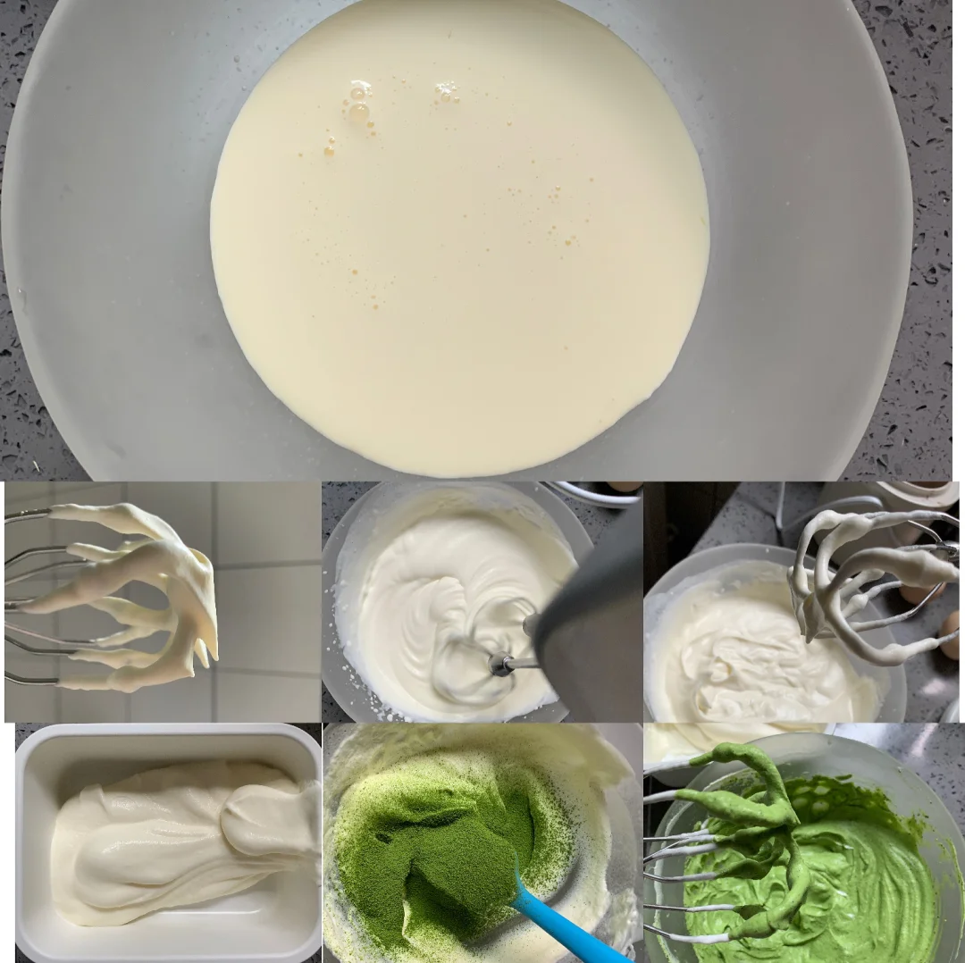 奶油120ml(推荐蓝风车,好打发,奶味香醇,细腻),牛奶50ml,盐一丢,抹茶粉8g。