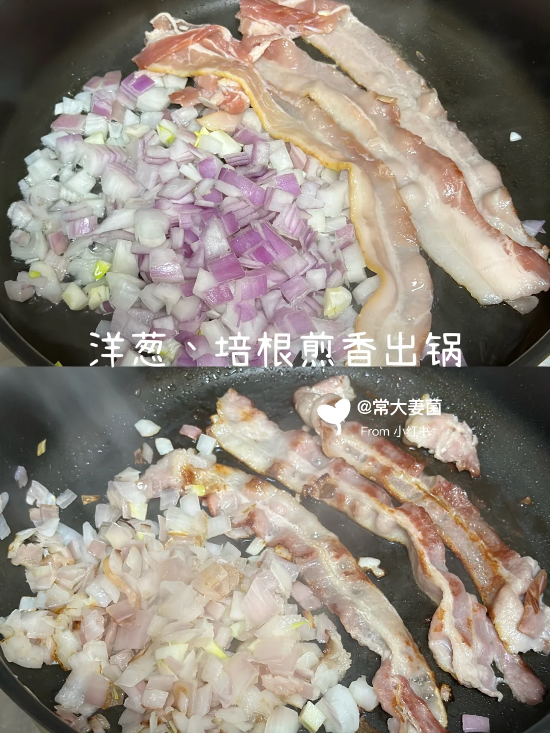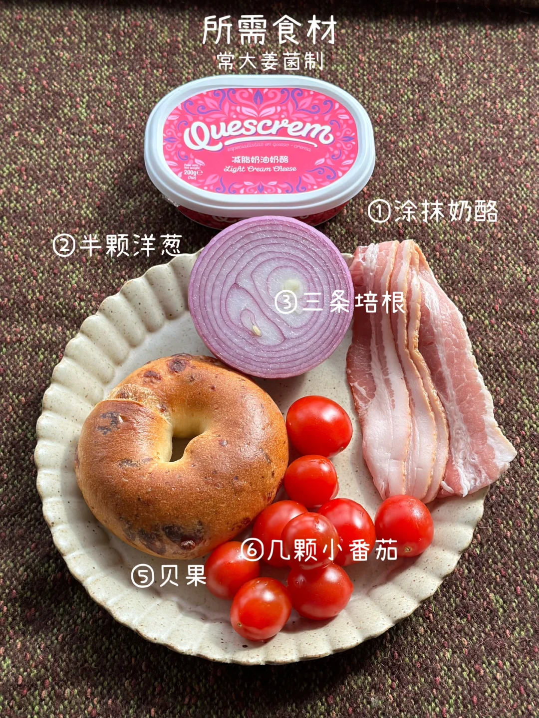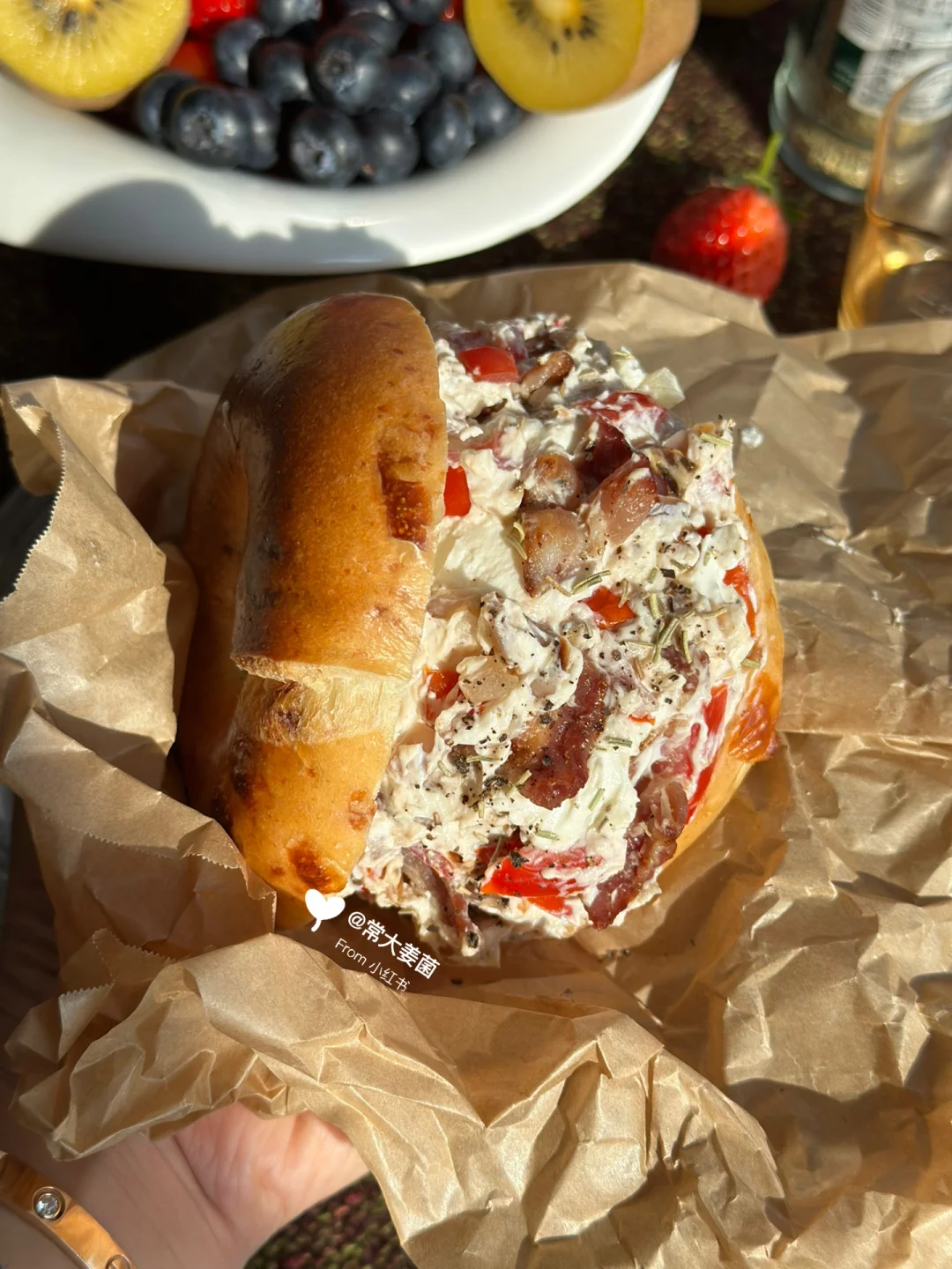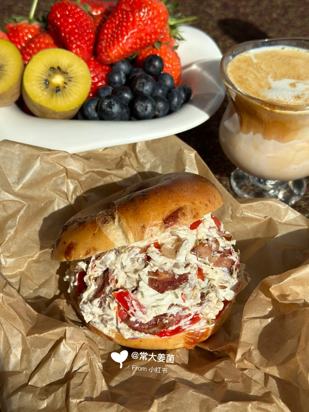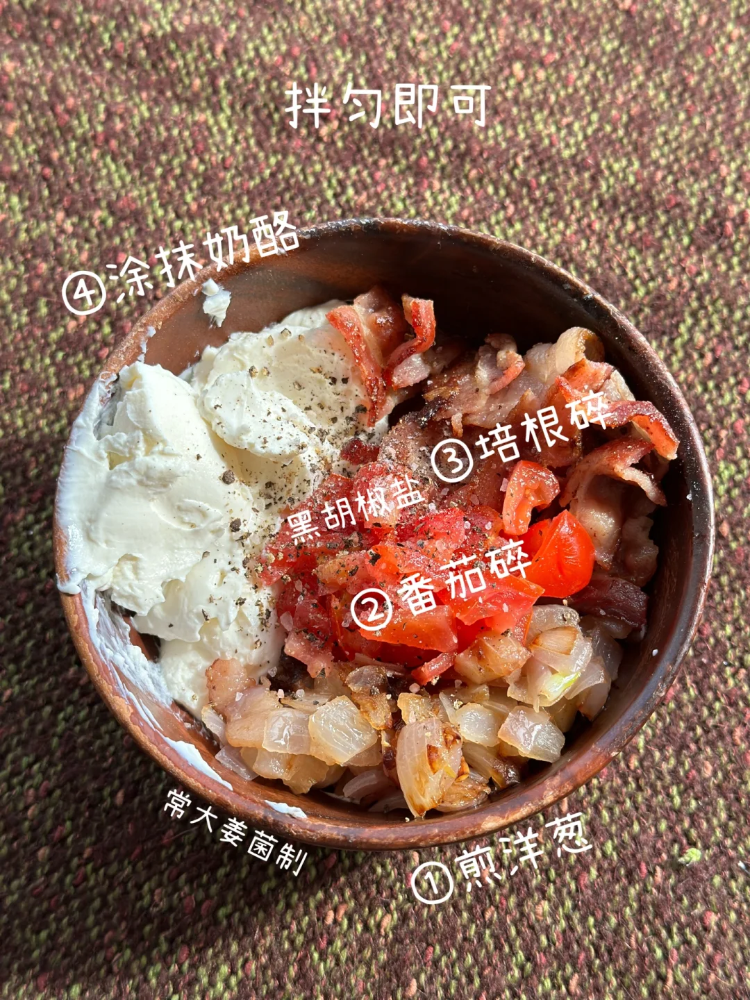 涂抹奶酪➕煎香的培根🥓和洋葱🧅