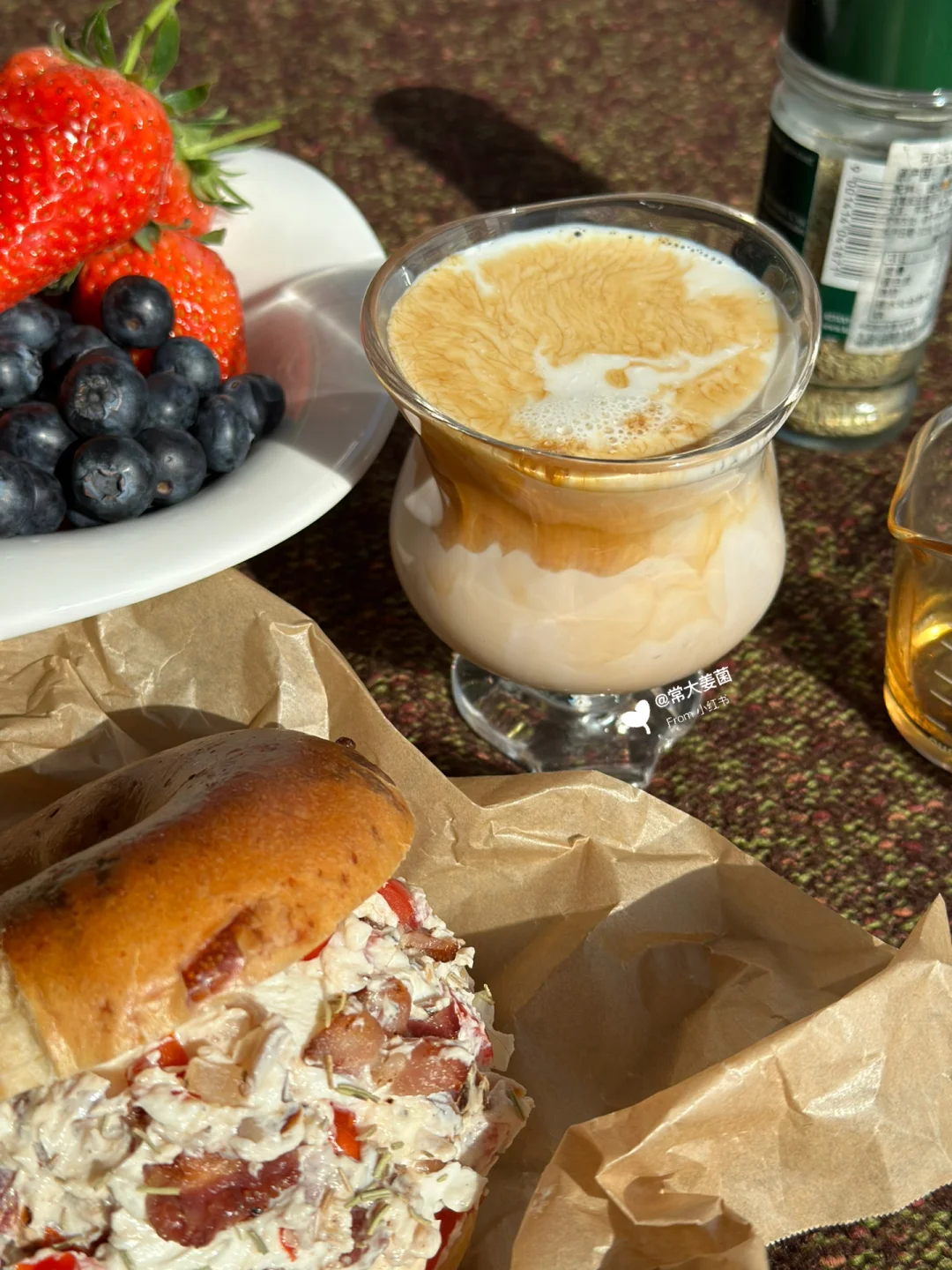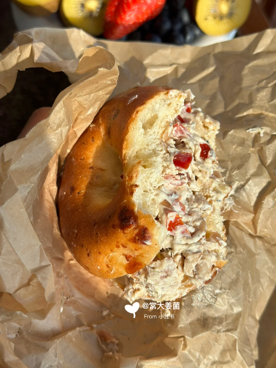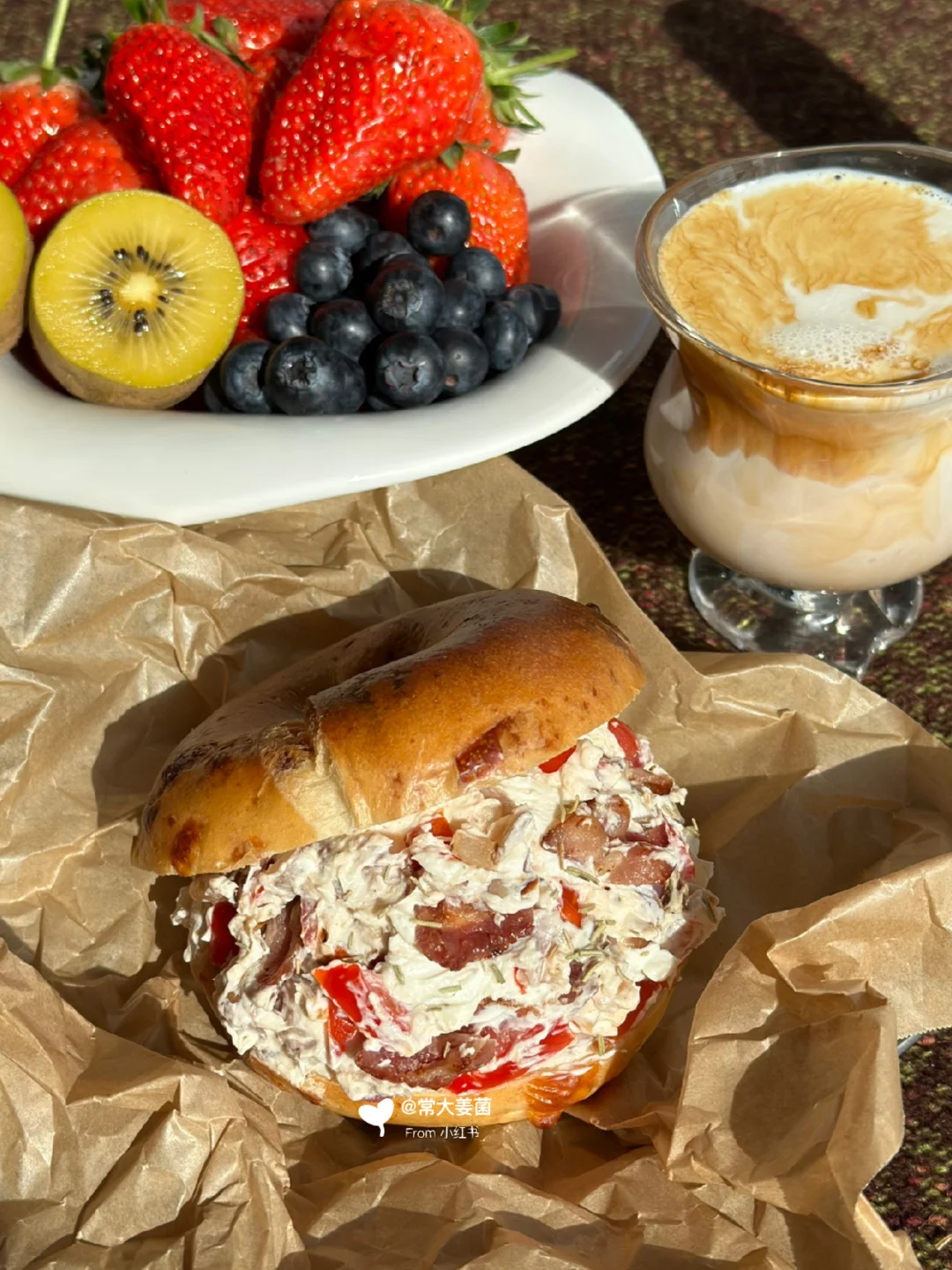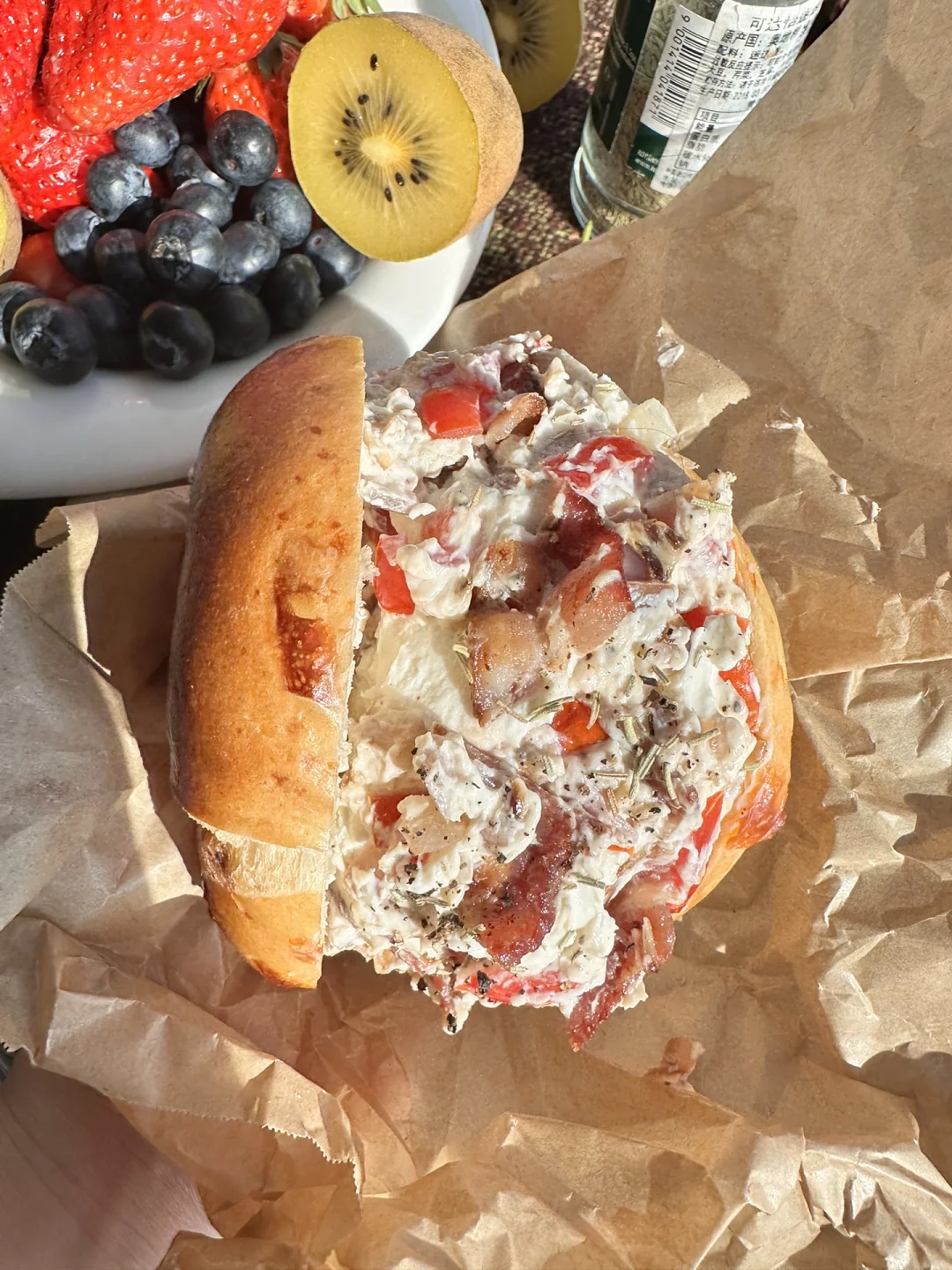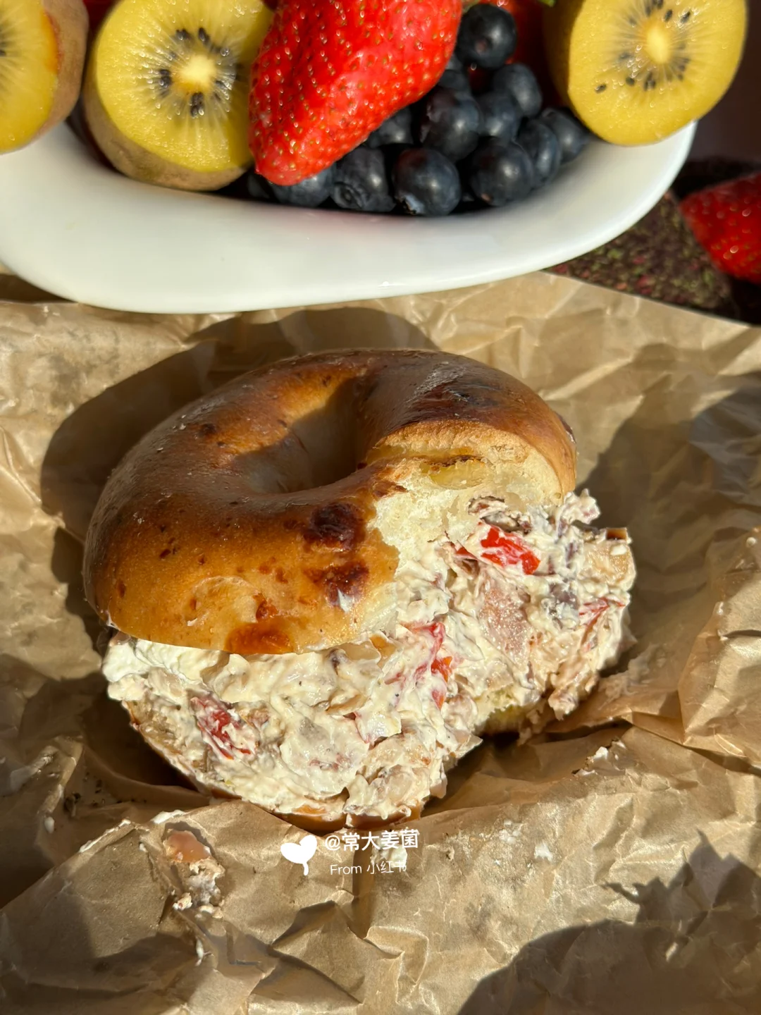 涂抹奶酪➕煎香的培根🥓和洋葱🧅