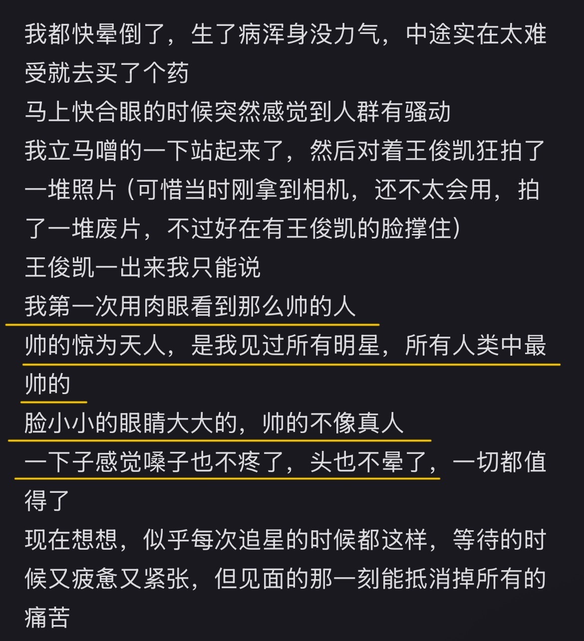 第一次肉眼近距离见王俊凯是不是都这种感受🤣🤣🤣“我第一次用肉眼看到那么帅的人,帅的惊为天人,是我见过所有明星,所有人类中最帅的。脸小小的眼睛大大的,帅的不像真人。一下子感觉嗓子也不疼了,头也不晕了,一切都值得了”“真人更是帅的炸裂,帅的可怕,没见过比他还帅的”