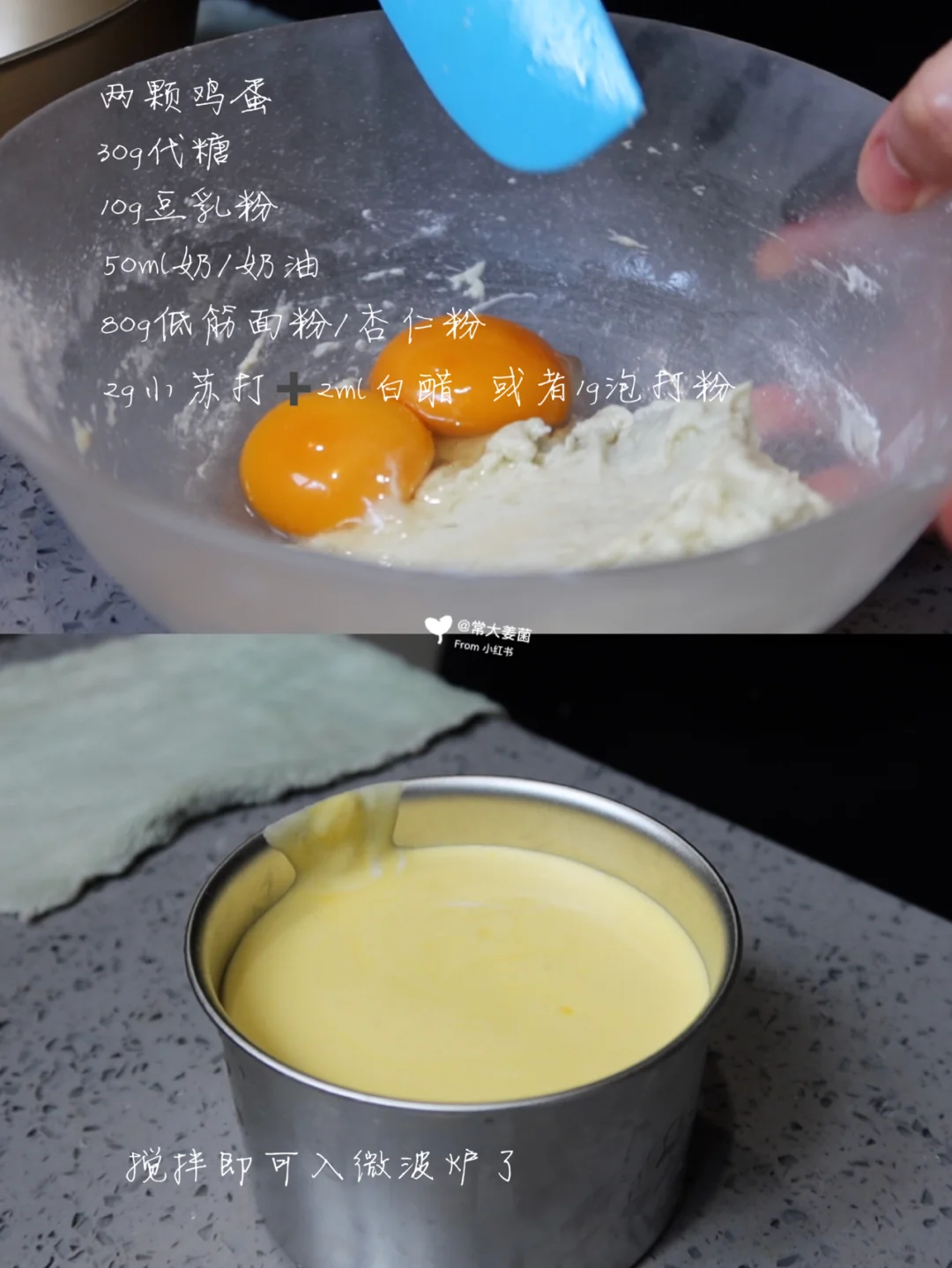 1颗蛋➕15g代糖➕5g豆乳粉➕25豆浆(或20豆浆➕油)➕40杏仁粉(低筋面粉也可,但会更干)➕1g泡打粉(可以用1g小苏打➕1g白醋)➕一丢香草精(也可不放)