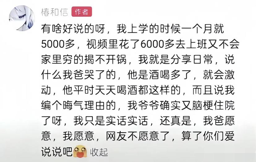 大家不要再同情这位父亲了 这都是他自己一手造成的, 双手有残疾的他,对一周花6600的女儿掩面哭泣,本来还有点难受,可看了他女儿的回复才知道,这都是他惯出来的。 在网友的质疑下,女儿回怼网友说,这是他们家的私事,她还在在上学的时候,家里一个月就给了她5000,也不知道网友为什么说她冷血。 这位父亲姓陈,早年在工地务工时遭意外,双手被坠落重物砸伤,,指尖扭曲变形,连攥紧东西都要憋足劲,重活干不了,只能靠小区门口摆摊修小家电、捡废品谋生。每天天不亮就蹲在垃圾桶旁翻纸箱、捋塑料瓶,攒够一捆扛去废品站,一斤几毛钱的利润,扛一次累得腰杆发颤,后背总被汗水浸出盐印;修家电时,用残手拧螺丝、接电线,指尖磨得通红起泡,结痂了又被铜线勒破,手上常年缠着旧胶布,却连块几块钱的护手霜都舍不得买。平时午饭就啃两个冷馒头,配着自带的腌萝卜,渴了接免费自来水,对自己苛刻到极致,唯独对女儿,从来没皱过一下眉。 女儿上高中时说同学都用新款手机,他没犹豫,咬牙凑两个月收入买了旗舰机型;说食堂饭菜难吃,每月直接给5000生活费,比同校学生多两倍还多,自己却连10块钱的盒饭都舍不得点;后来上了大学,女儿要名牌包包、跟同学打卡网红店、追星买周边,每次伸手要钱,他哪怕熬夜捡废品、多接几单修家电的活,也会按时凑够转过去,从没想过问钱花在哪,更没教过她赚钱不易。久而久之,女儿早把这份付出当理所当然,收了钱从不说谢谢,偶尔凑钱慢了还会发消息催促,语气满是不耐烦,可他总自我安慰“就一个女儿,疼着点咋了”,压根没察觉,这份无底线的溺爱,早把孩子养得没了感恩心。 如今女儿一周花6600,大概率全砸在逛街购物、聚餐玩乐上,反观他,为凑钱每天摆摊到深夜,下雨下雪就躲小区屋檐下守摊位,怕家电淋坏冻得双手发紫;生病发烧硬扛着不吃药,却在女儿要奢侈品手链时,悄悄把攒三个月的废品钱转过去。可真到他扛不住掩面哭,网友替他不值时,女儿非但没愧疚,反倒理直气壮回怼,拿上学时5000生活费当借口,说这是家事,仿佛网友的质疑都是多管闲事,完全没看见父亲残手上的伤口、脸上的皱纹,没想起那些钱是父亲用血汗换的。 说到底,这位父亲的委屈,都是自己酿的苦果。他以为无条件满足就是爱,却忘了教育孩子最该教感恩、懂体谅,一味纵容只会让孩子变得自私冷漠,把索取当本能,连基本的心疼都做不到。女儿从没见过他翻垃圾桶的狼狈、修家电的艰难,自然不懂珍惜,更不觉得一周花6600有问题。真正爱孩子,从不是无底线溺爱,是既要给关怀,也要让她知生活艰辛,教她担当。他把所有苦自己扛,却把孩子养成“白眼狼”,如今哭着后悔,可孩子价值观早已成型,再想纠正难如登天。 后来有网友翻出女儿社交动态,全是名牌穿搭、高档餐厅打卡,字里行间满是优越感,从没提过父亲半句,这份冷漠比花钱挥霍更寒心。父亲的溺爱像温水煮青蛙,磨掉了女儿的感恩心,也让自己陷困境,这样的结果,可悲却不值得同情。各位读者你们怎么看?欢迎在评论区讨论。