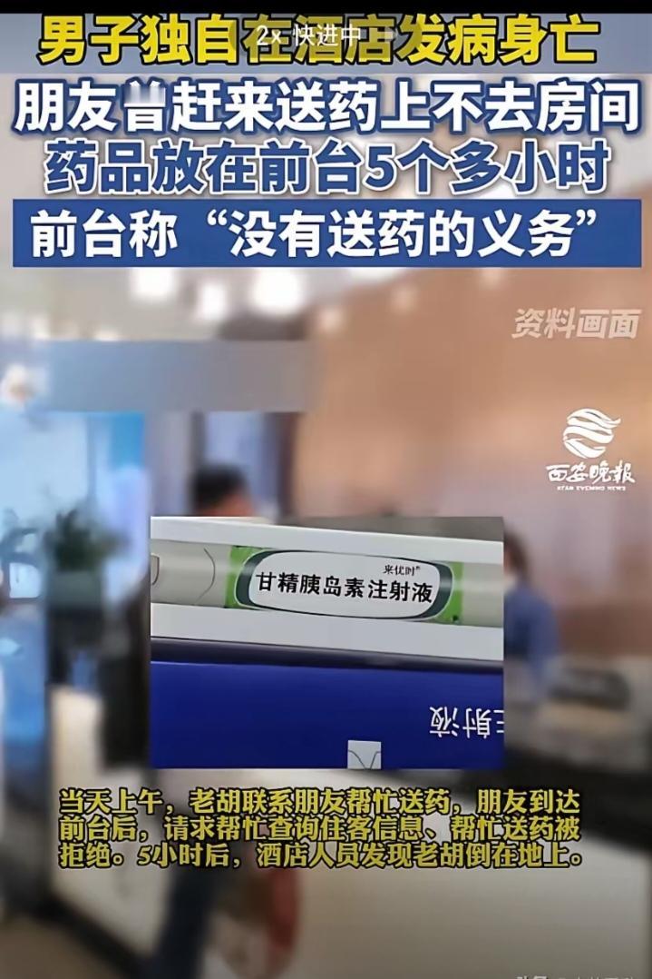 痛心!武汉一男子独自住酒店感觉身体不舒服,联系朋友送药,朋友赶来后联系前台帮忙查询男子信息、帮忙送药。结果,被前台拒绝,5个小时后酒店工作人员查房发现男子倒在地上发病身亡,家属前往讨要说法。前台称:“没有送药的义务!” (素材来源:封面新闻) 当天,51岁的男子突然感觉身体很不舒服,他一个人在酒店房间里,只能赶紧联系自己的朋友,希望朋友能送点药过来救救急。 朋友接到电话后,心急如焚,二话不说就往酒店赶。朋友赶到酒店后,朋友急忙跑到酒店前台,对工作人员说:“您好,我有个朋友住在这酒店里,他身体不舒服,我给他送药来了,麻烦您帮我查一下他的房间信息,再帮忙把药送上去,他现在特别需要这药。” 可谁能想到,酒店前台的工作人员却说:“我们这没有送药的义务”,朋友无奈,只能把药放在柜台上,并留言男子自己下来拿。 就这样,整整五个小时过去了,酒店工作人员按照惯例去查房。当他们打开男子的房间门时,只见男子倒在地上,身体已经没有了任何动静。工作人员赶紧拨打了急救电话,可一切都太晚了。男子因为没能及时得到药物救治,已经发病身亡。 说没送药义务确实没毛病,但住客在酒店出了人命,这安全保障义务总不能甩锅吧?人家朋友把救命药都送到门口了,前台多走几步路的事,非要死守那所谓的“规定”。真要是心脏病、高血压这种急症,耽误的每一分钟都是生死线。 酒店收了房费,就该对住客的安全上点心,不是只给个房间就完事了。这事里酒店肯定脱不了干系,至少得负次要责任,毕竟是因为没及时传递药物,间接导致了悲剧。网友们都在说,规则是死的人是活的,多一点人情味,可能就能救一条命。各位读者你们怎么看?欢迎在评论区讨论。