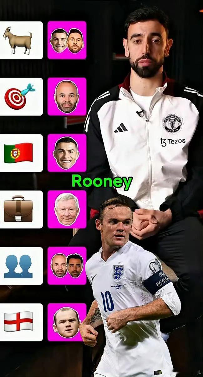 布鲁诺·费尔南德斯在问答环节给出以下答案:历史最佳球员 —— C罗和梅西最佳中场 —— 伊涅斯塔最佳葡萄牙球员 —— C罗最佳教练 —— 弗格森最佳中场组合 —— 伊涅斯塔和哈维最佳英格兰球员 —— 鲁尼最佳主教练——弗格森