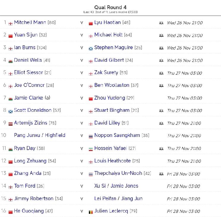 斯诺克英锦赛资格赛第四轮完整赛程! 中国军团大概率9人参加争夺,他们是袁思俊、吕昊天、周跃龙、贺国强、张安达、龙泽煌、徐思、雷佩凡、庞俊旭。