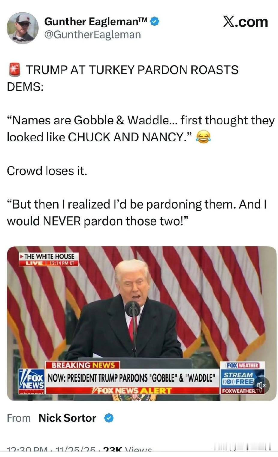 川普在火鸡赦免仪式上嘲讽民主党人:“它们的名字叫“咯咯”和‘摇摇”。一开始我还以为是查克和南希呢。”人群哄堂大笑。 “但后来我意识到我要赦免它们。而我绝不会赦免那两个人!”[允悲][允悲][允悲]