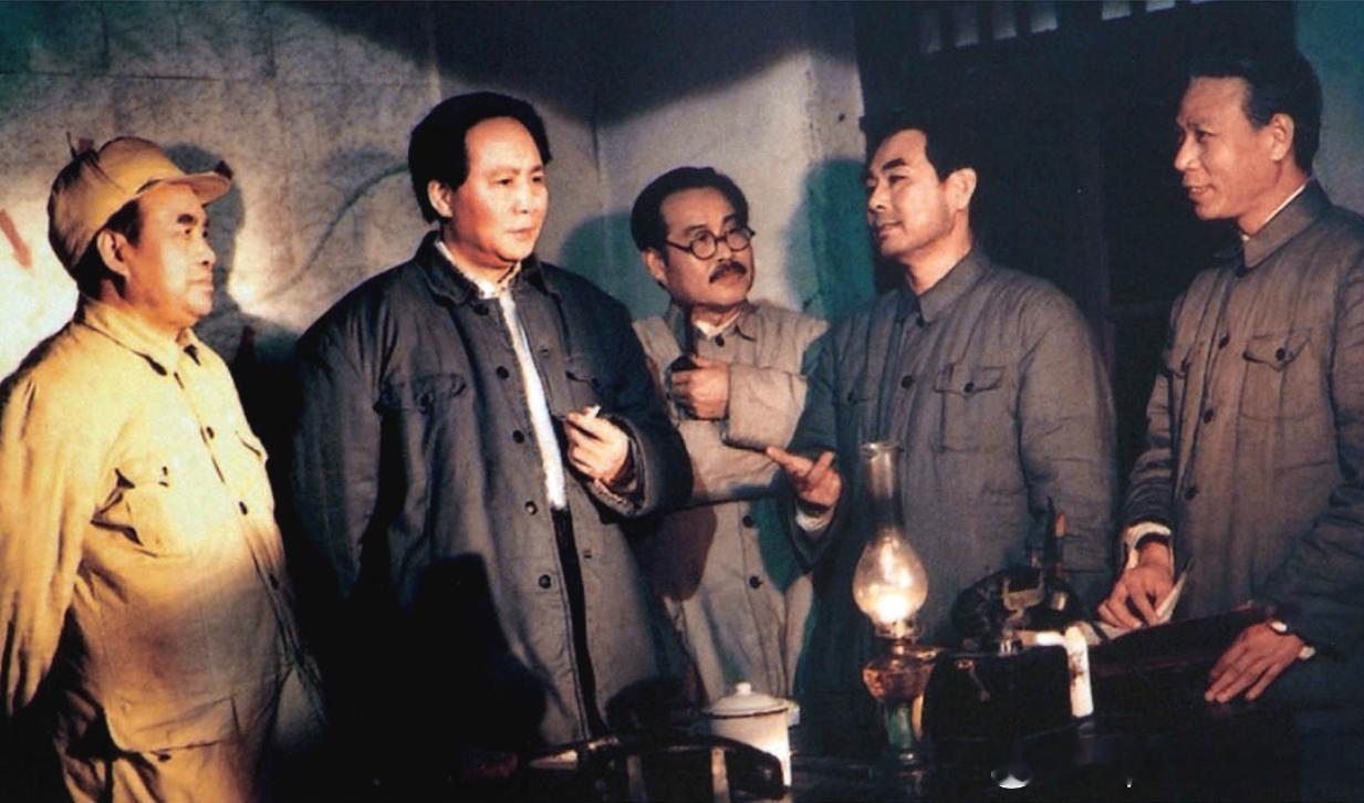1989年电影《开国大典》剧照,五大常委交流,左起刘怀正饰演的朱德、古月饰演的毛泽东、路希饰演的任弼时、黄凯饰演的周恩来和郭法曾饰演的刘少奇