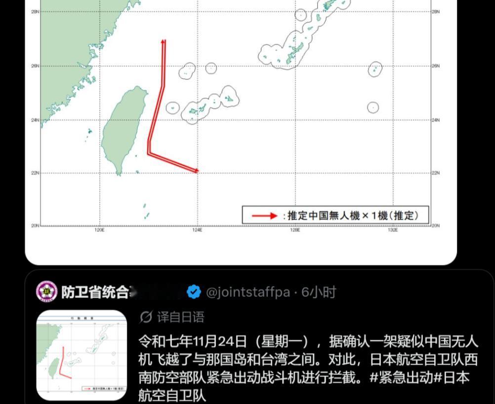 日本拦截我机目的何在 日本自卫队发布消息自称于24日,在近台海域起飞战斗机拦截我方无人机。 联想日本防相此前表态及在近台岛屿部署中程导弹,可以判知,日本显然根本没打算对中国示弱,更不打算反转敌华朝向。 先说说这拦截发生的地方,近台海域可不是普通海域,与那国岛就在这附近,距离中国台湾才110公里,相当于从市区到郊区的距离。 日本把这里当成了监控台海的前哨,早在2016年就往岛上派了沿岸监视部队,后来又陆续加派电子战部队,现在连03型地对空导弹都要部署上去了。 我方无人机在这一海域活动,本是正常的巡航行动,日本却急着派战斗机拦截,说白了就是想在这个敏感区域刷存在感,向外界宣告它“有能力插手台海事务”。 这背后离不开日本军方和极右势力的互相撺掇。 现在的日本政府里,极右思想早就不是秘密,首相高市早苗频频在涉台问题上放狠话,防卫大臣小泉进次郎更是把“强化岛屿防卫”挂在嘴边,却对自己挑动地区紧张的事实睁一只眼闭一只眼。 他们心里打的算盘很清楚,越是渲染“中国威胁”,越能为扩充军备找借口。 去年日本的防卫预算已经突破8万亿日元,今年更是涨到了8.7万亿,这些钱没少花在远程导弹、隐形战机上,光采购F-35A的配套导弹就砸了不少钱,明眼人都能看出来,这不是自卫,是在为打仗做准备。 更值得警惕的是,日本现在的动作越来越有“谋战”的味道。 与那国岛除了部署防空导弹,还安插了电子战部队,配备的NEWS系统能干扰通信和雷达,完全是实战化配置。 他们甚至计划把射程500到600公里的HVGP Block 1导弹也部署到琉球一带,这导弹要是真放过来,射程都能覆盖到中国大陆本土了。 这次拦截无人机,不过是他们检验自身快速反应能力的一次演练,也是在试探中方的底线——看看我们的反应,摸摸我们的底牌,为后续更冒险的动作探路。 有人说日本就是美国的跟班,这话没错,但它可不是个老实的跟班,反而像条挣脱不了绳子却拼命狂吠的恶犬,对华强硬的劲儿比主子还足。 美国想在亚太牵制中国,最需要日本这个“桥头堡”,所以对日本扩军睁一只眼闭一只眼,甚至还卖“战斧”巡航导弹给它。 日本正好借这个机会,一边抱美国大腿要支持,一边偷偷壮大自己的军力,想摆脱战后体制的束缚,重新当回“军事大国”。 这种互相利用的关系里,日本比美国更激进,因为美国还得考虑全局,不想和中国直接硬碰硬,而日本却巴不得把水搅浑,好浑水摸鱼。 日本心里清楚,台海是中国的核心利益,在这附近搞动作最能刺痛中国。 他们一边宣称拦截无人机是“防御性措施”,一边却在石垣岛、宫古岛等多个岛屿部署导弹部队,形成包围之势。 这种口是心非的操作,本质上就是在挑战中国的底线。 从2019年在奄美大岛部署导弹,到2023年在石垣岛建驻屯地,再到现在推进与那国岛的导弹部署,日本的军事布局一步步向台海逼近,拦截我方无人机不过是这个大计划里的一个小环节。 最危险的是,日本的极右势力正在刻意煽动对华敌意,把中国塑造成“最大威胁”,以此凝聚国内共识。 他们选择性忘记二战的侵略历史,反而把自己打扮成“受害者”,这种历史修正主义的歪风,正在让日本的军事冒险倾向越来越明显。 军方需要极右势力的政治支持来推动扩军,极右势力需要军方的强硬来巩固自身地位,两者一拍即合,就形成了现在这种不断挑事的局面。 说到底,日本拦截我机,既是为了配合美国的亚太战略,又是为了实现自身的军事野心,更是军方与极右势力勾结的必然结果。 它以为抱上美国的大腿就能为所欲为,以为搞些军事部署就能吓住中国,却忘了中国早已不是百年前的中国。 外交部说的“三个决不允许”不是空话,我们有足够的实力捍卫国家领土主权。 日本要是继续沿着敌华的路走下去,只会把自己拖进危险的深渊,到时候再想回头可就晚了。