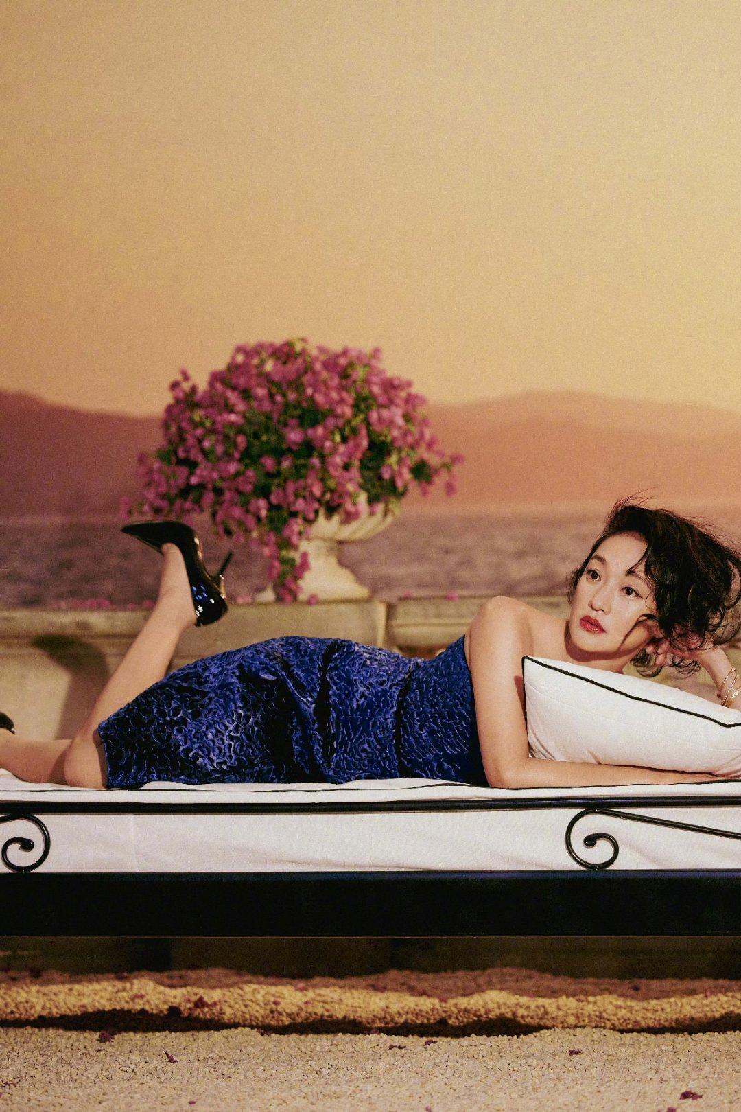 周迅深蓝色抹胸长裙自带绸缎纹理的高级光泽,裹身版型衬出慵懒曲线;微卷短发被风轻轻吹乱,红唇配鎏金细镯,每一帧都像复古电影里的名场面!暖调黄昏+盛放的花簇当背景,松弛又迷离的氛围直接拉满
