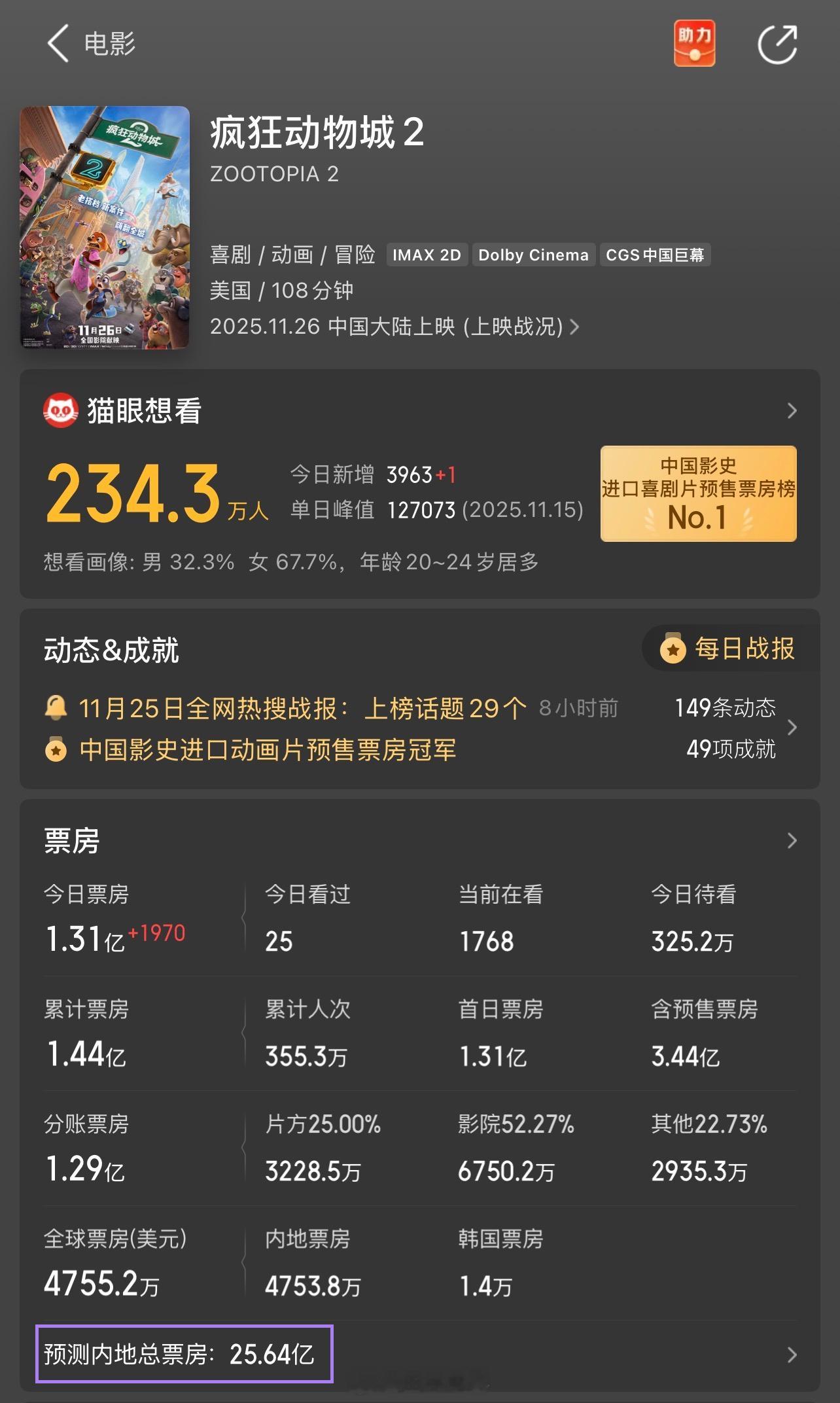 疯狂动物城2中国影史动画预售票房冠军《疯狂动物城2》预售破3亿,内地票房预测25.64亿,目前看是今年最火的引进片,很可能是继《哪吒2》之后最火动画电影。谁能想到,院线要靠进口片来救市,除了《狂野时代》,最近国产片集体哑火......田宇院线播报