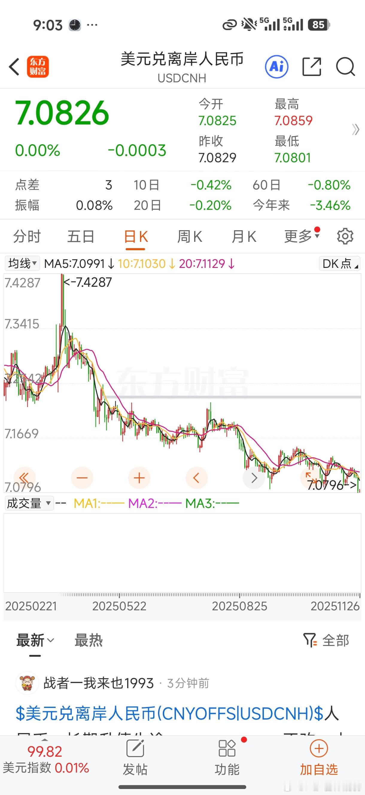 人民币汇率创一年多新高7.08啦,距离我的成本6.8还有4%快解套的心情