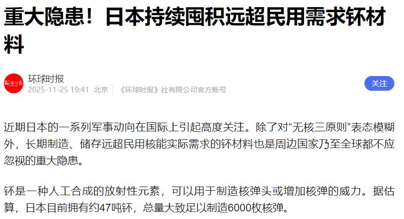 难怪高市早苗叫嚣武力介入台海,日本储存大量核材料,可制造6000枚核弹! 最近一位大学教授在媒体上披露的数字,着实让人惊出一身冷汗,日本这个二战战败国手里竟然攥着47吨钚材料,按常理推算,这些东西足够造出6000枚核弹头。全球现役核弹总数也才一万多枚,而日本的这一囤积就快赶上半个核大国的规模了。 更有意思的是日本政府的辩解,口口声声说这些钚是给民用核电准备的。可稍微算笔账就知道这话说不通,福岛核事故后,日本现在能正常运转的核反应堆只剩9台,而且用的都是低浓度铀燃料,根本用不上钚。 就算按照日本2018年能源计划里最乐观的估计,到2030年把用MOX燃料的反应堆增加到18个,一年顶天也就消耗2.6吨钚。 但现实是,日本一边没有明确的消耗计划,一边还在每年从英法两国进口8吨钚,这进多出少的账,明眼人都能看出不对劲。 说起来日本也是个"特殊"的国家,它是全球唯一一个不拥有核武器,却能从核电站乏燃料里提取钚的国家,这背后离不开《日美核能协定》的撑腰。但特殊身份不是胡来的理由,尤其是对一个有过军国主义历史的国家来说,军事领域的任何小动作都该被盯着。 中国常驻国际原子能机构代表在最近理事会上指出的,日本一边标榜自己是"和平国家",一边对"无核三原则"含糊其辞,甚至暗示要搞"核共享",高官还放话不排除引进核潜艇,这些动向本来就够让人警惕了,现在再加上这么多来历不明的核材料,谁能放心? 钚这东西不是闹着玩的,一旦落入不当之手,后果不堪设想。作为《不扩散核武器条约》成员国,日本明明有义务控制核材料储备,却反其道而行之,这种做法不仅违背国际义务,也给地区安全埋下了定时炸弹。 国际社会不能再眼看着它打着和平的幌子,悄悄攒着制造核弹的本钱。日本不光要给个清楚的解释,更得拿出实际行动处理掉这些多余的钚材料。