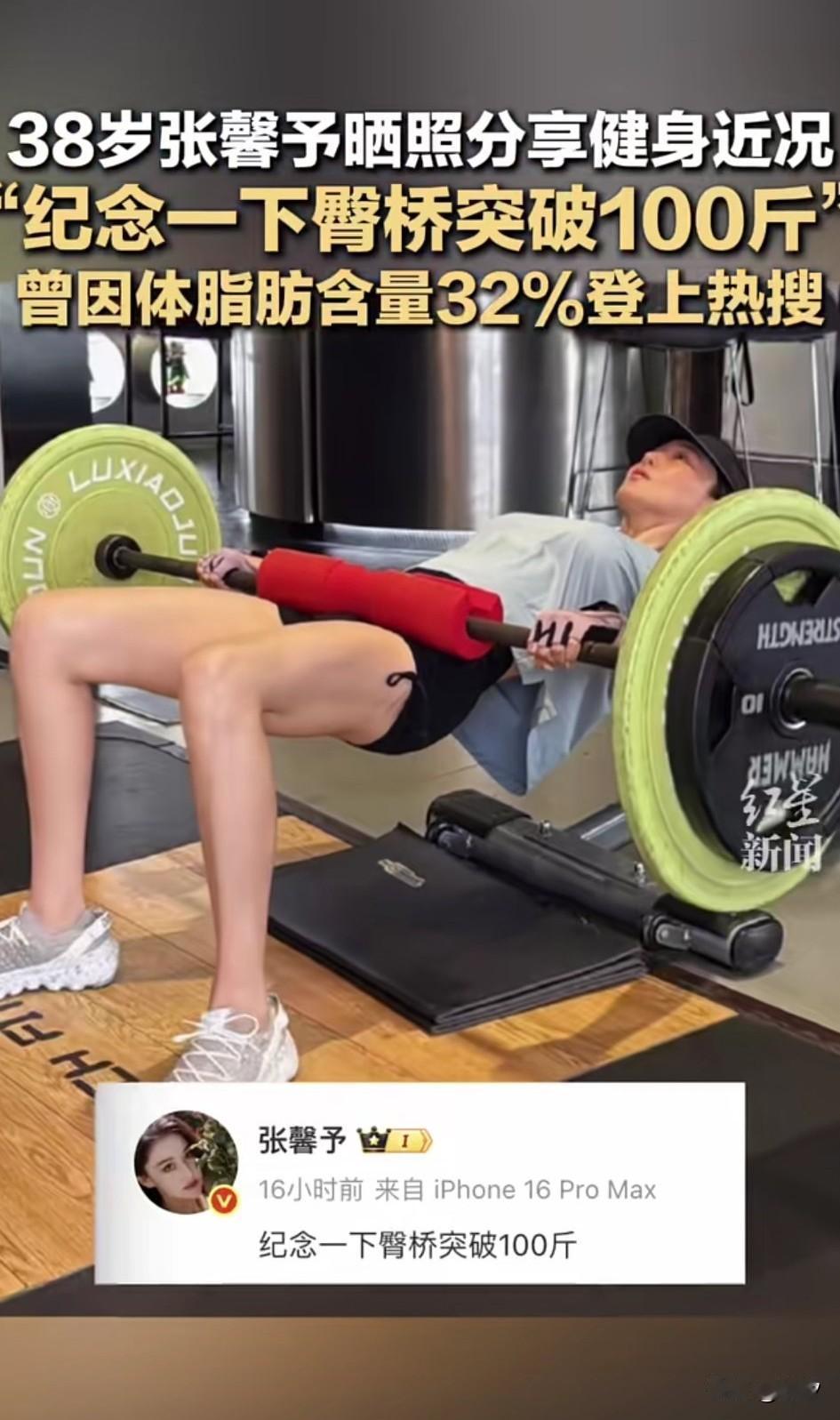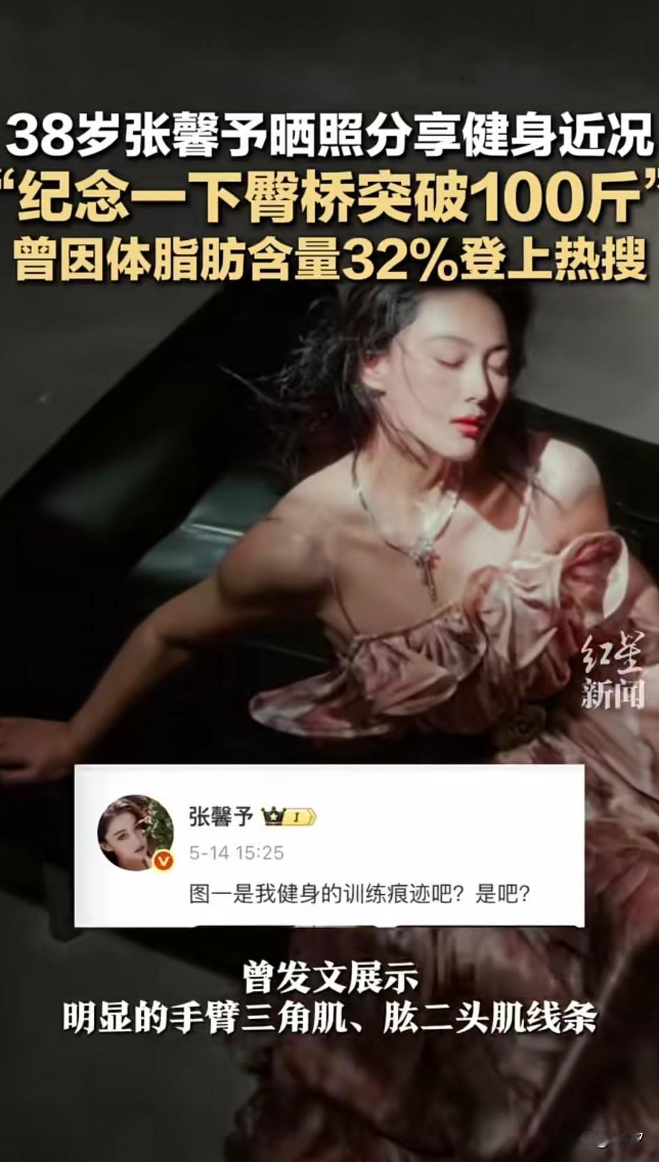 38岁的张馨予晒照分享健身近况, 她表示要纪念一下, 殿桥突破100斤, 曾因脂肪含量32%登上热搜, 从她的健身照可以看出, 她确实非常努力的在健身, 不是所谓的作秀, 本来就非常美丽的张馨予, 如今秒变肌肉女, 肱二头肌,三角肌线条非常明显, 明星都热衷于健身, 有些是为了塑形, 可张馨予就是为了练肌肉吧! 还真是一位非常有个性的女生, 有毅力的女性运气都不会差, 大家对于张馨予健身练肌肉怎么看? 张馨予 张馨予演技 张馨予自拍 张馨予自拍 张馨予素颜旅行 张馨予自驾游