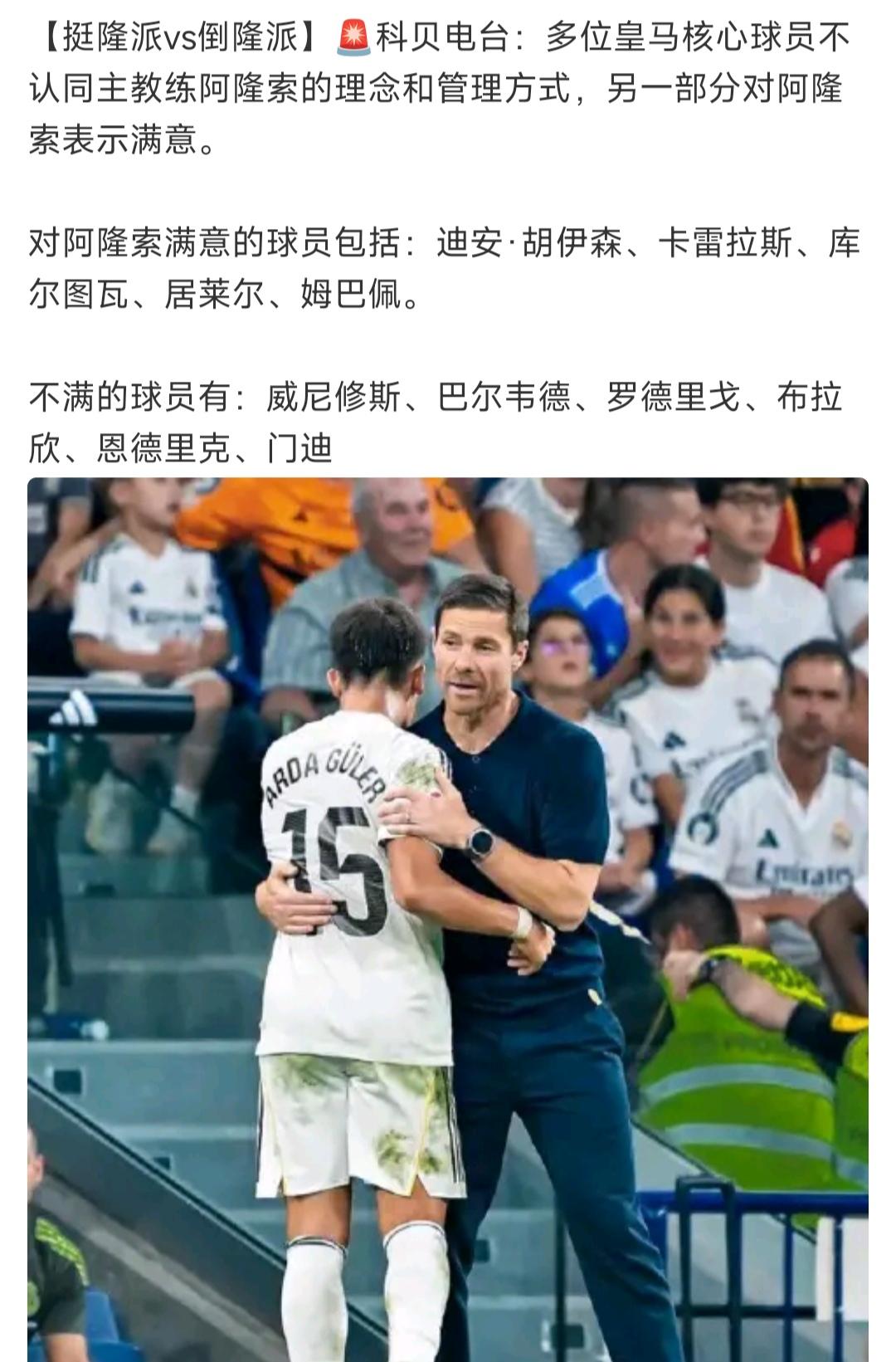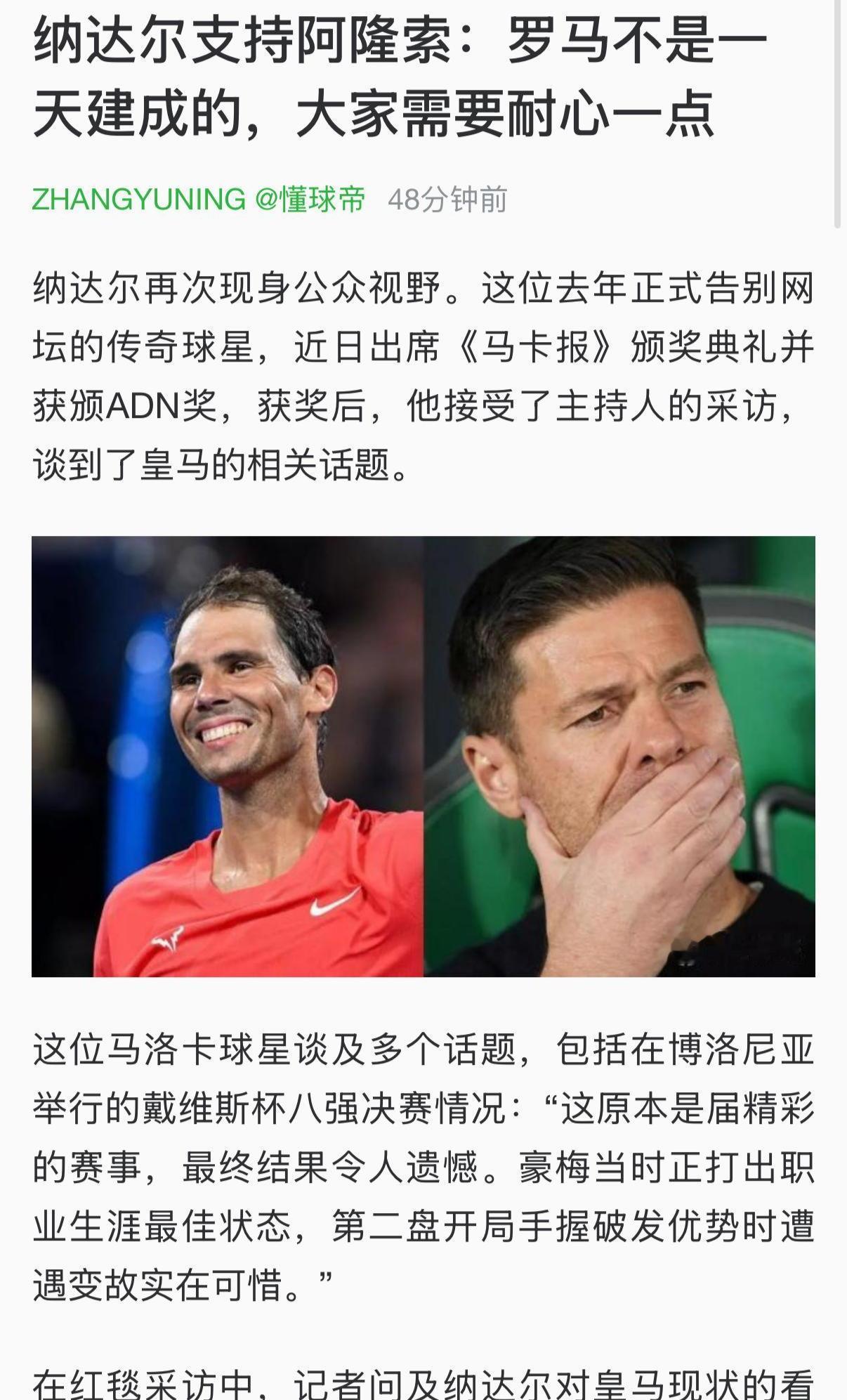纳达尔支持阿隆索有什用?? 现在皇马内部分成两派,一派没机会上场的就反阿隆索,一派有机会踢比赛的就支持阿隆索。 皇马在西甲还领先1分,内部就乱套了。 假设接下来连续输球,阿隆索必须下课。 纳达尔只是皇马球迷,大多数皇马球迷只看结果,西甲冠军到底有没有,欧冠冠军能不能拿到,没有的话再见了。[思考]