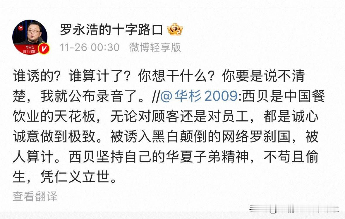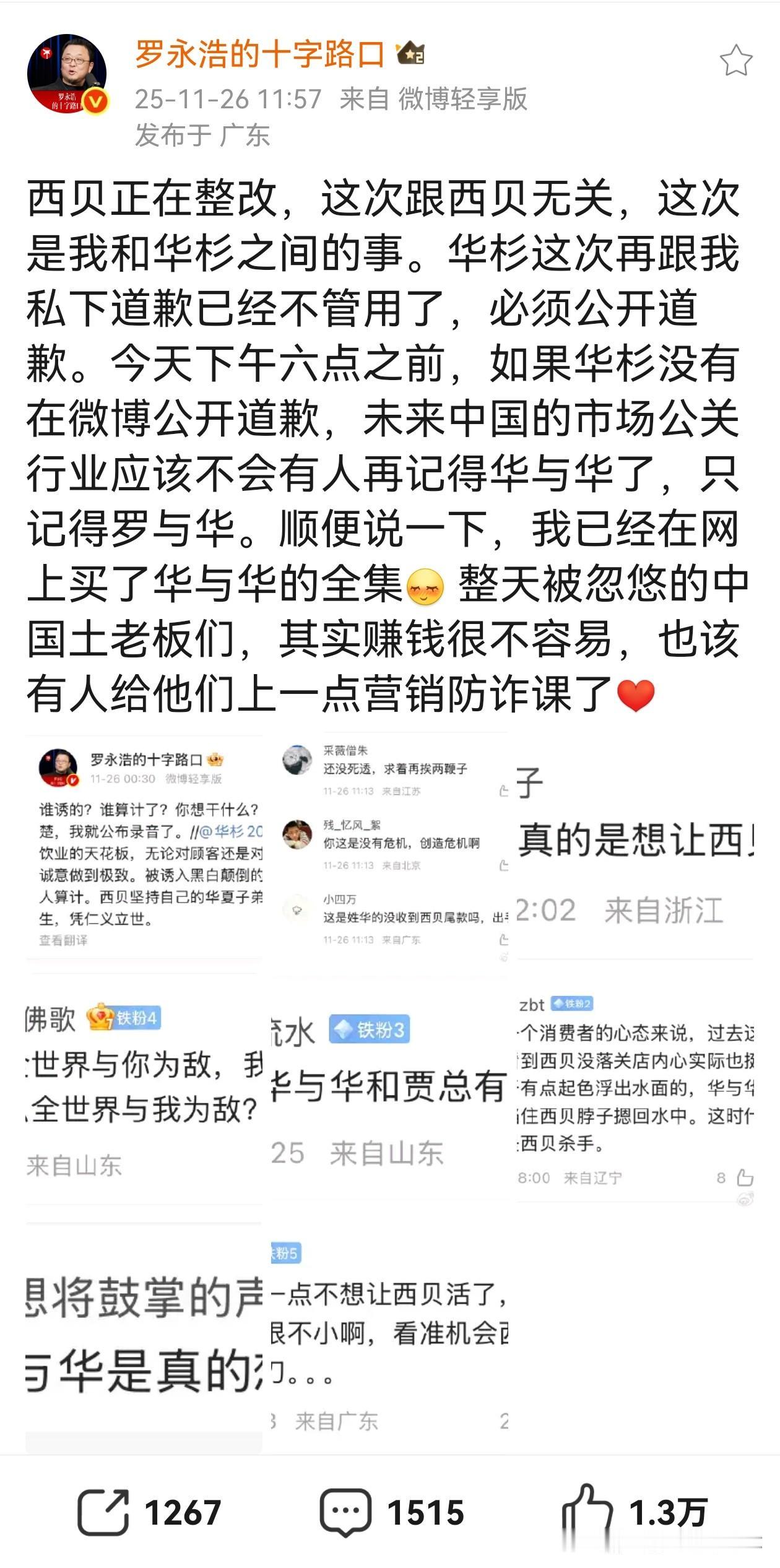 西贝和华与华的瓜越来越大了, 罗永浩再次公开喊话华与华, 私下道歉已经没有用了,